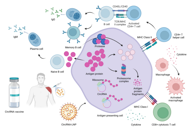 其次,circRNA即使数量适中,也能高度免疫原性地表达特定抗原以进行抗原呈递。