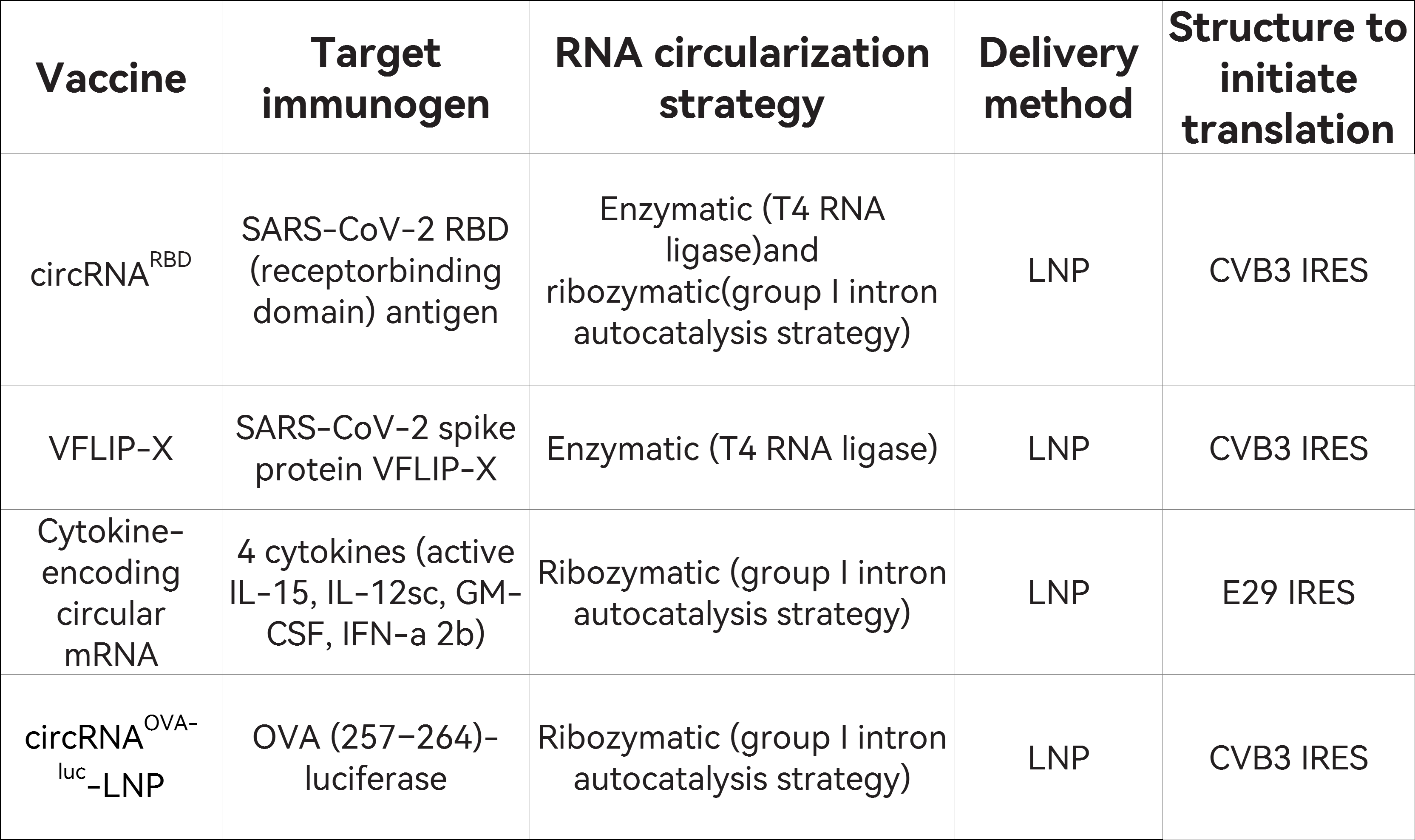 如表1所示,circRNA疫苗的特征,包括其高稳定性、在蛋白质表达方面的高效性、稳定且持久的表达产物以及启动免疫反应的能力,是它成为上述疫苗的有潜力替代品的原因。此外,circRNA疫苗优于mRNA疫苗。其制备程序和保存条件简单经济,更适合大规模生产和广泛应用。