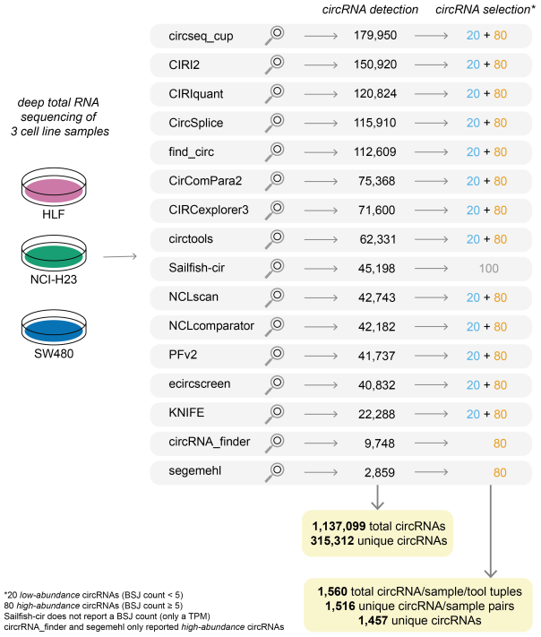文章对3种人类癌症细胞系的total RNA进行了深度测序,通过16种知名的检测工具识别到了315312个环状RNA,随后通过三种正交的低通量验证方法:
