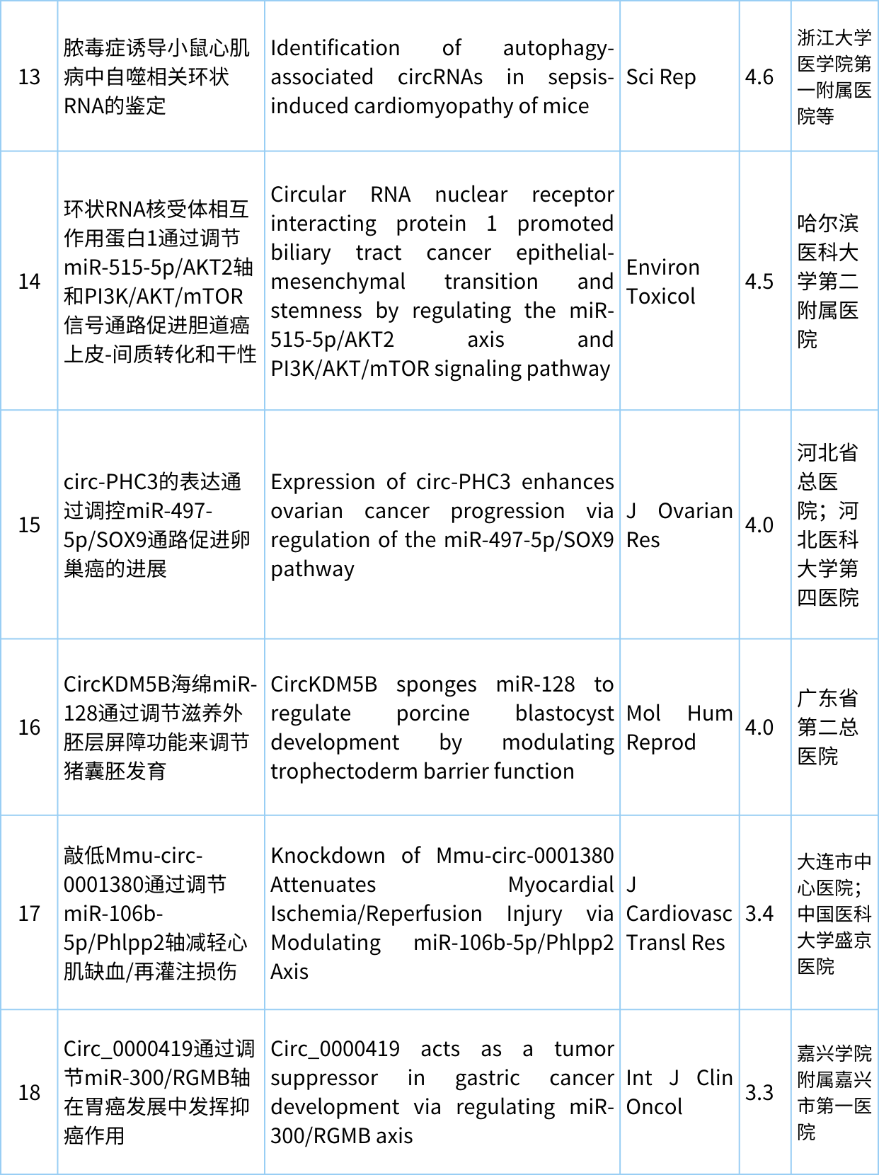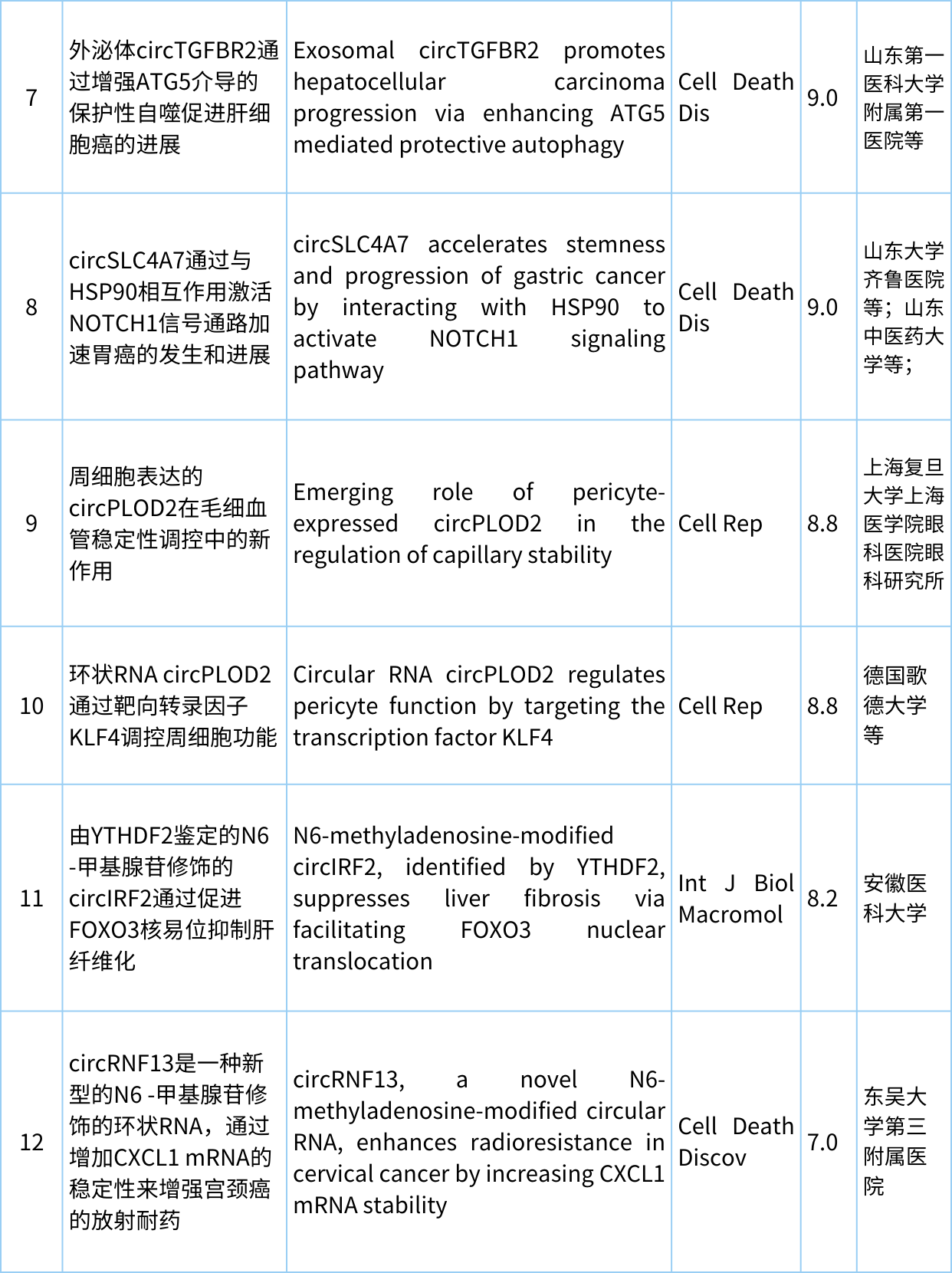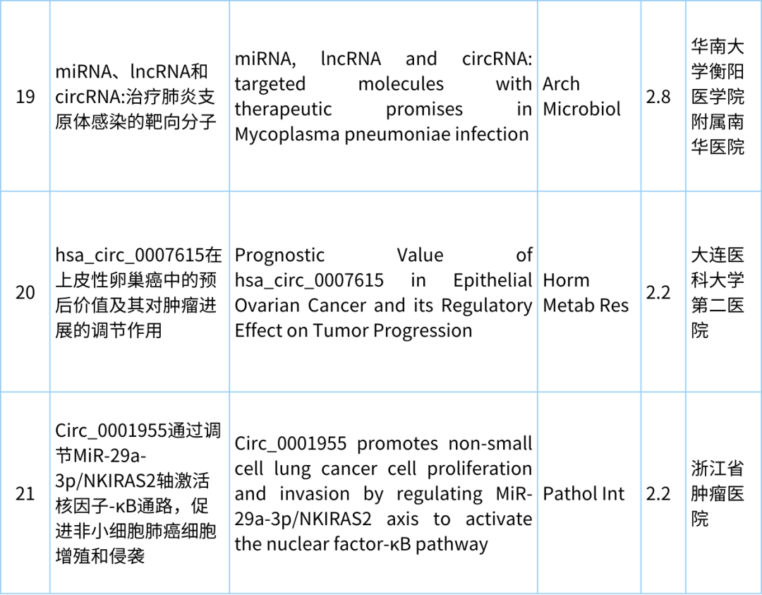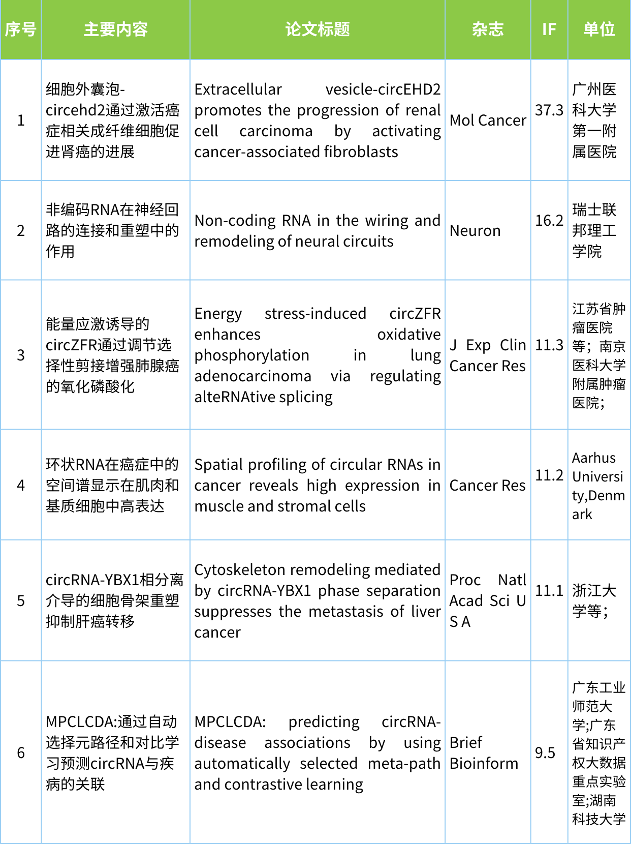 欢迎各位来到“circRNA研究汇总”栏目,本期从pubmed中检索收集最新发布的circRNA文献共计21篇,现在让我们一起看看circRNA研究最近有哪些新进展。 检索式:(circRNA[Title/Abstract]) OR circular RNA[Title/Abstract] 研究汇总列表 分类: circRNA与疾病, circRNA生物学, 前沿动态, 最新重要进展, 每周进展汇总, 研究热点跟踪admin七月 24, 2023评论