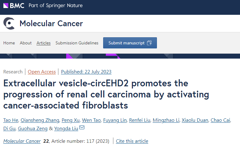 2023年7月22日,广州医科大学附属第一医院泌尿外科曾国华教授团队刘永达教授课题组(刘永达教授为通讯作者,何涛博士后及张乾升硕士为本文共同第一作者)在《Molecular Cancer》(IF=37.3)发表了题为“Extracellular vesicle-circEHD2 promotes the progression of renal cell carcinoma by activating cancer-associated fibroblasts”的研究论文。该研究发现了circEHD2通过circEHD2/YWHAH/YAP/SOX9信号轴促进肾癌的增殖,而外泌体circEHD2通过将成纤维细胞转化为CAFs促进肾癌的转移。该研究揭示了circEHD2在肾癌进展中的新机制,并有可能成为肾癌新的治疗靶点。
