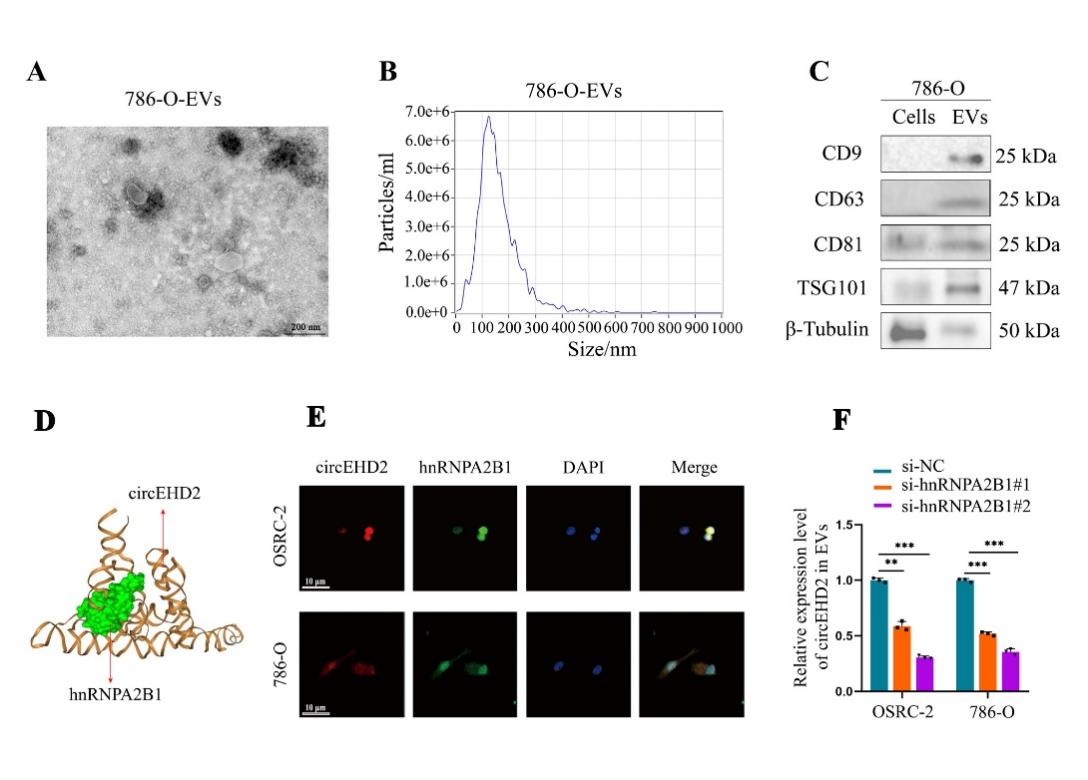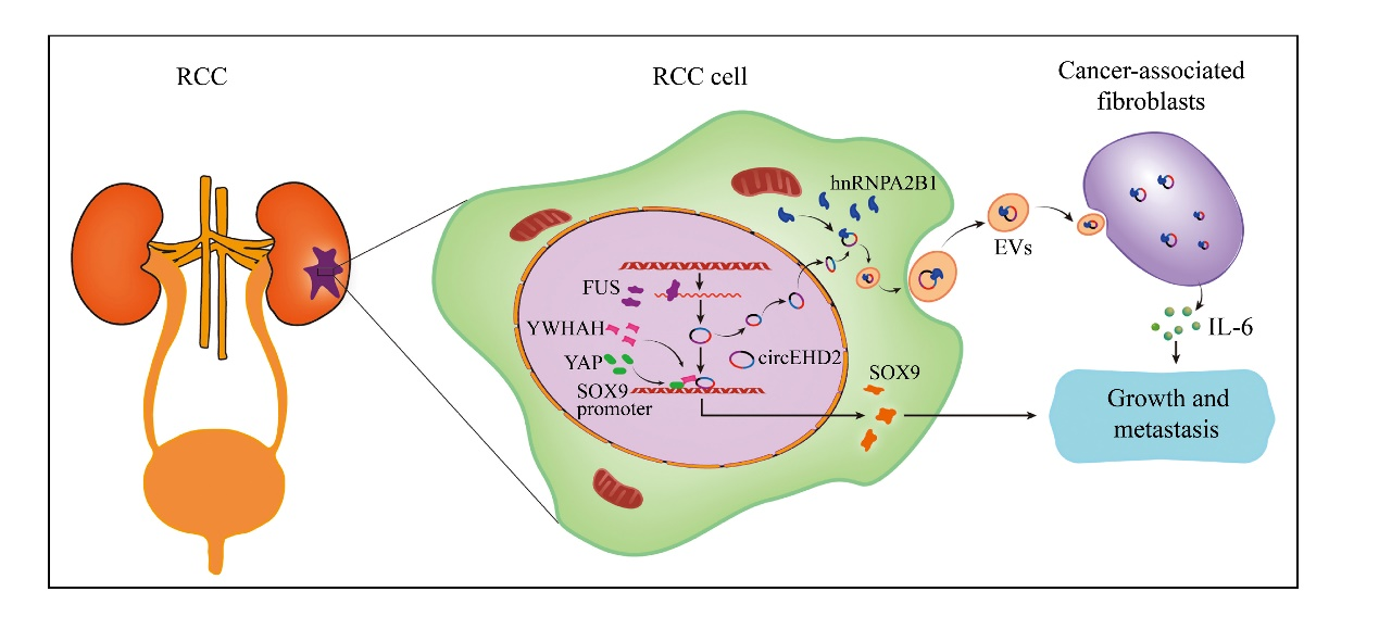 肿瘤相关成纤维细胞(Cancer-associated fibroblasts, CAFs)作为肿瘤间质中的主要细胞类型,在促进肿瘤的发展和转移中扮演着至关重要的角色。而外泌体(Extracellular vesicles, EVs)是由各种细胞释放的细胞外颗粒,其中包含各种生物活性分子,如脂质、蛋白质和核酸(包括circRNA)。最近研究证实,来源于肿瘤细胞的EVs可以作为信息传递者,可将生物活性分子传递到远处的器官,从而重塑转移部位的微环境,促进肿瘤的转移。但是,在肾癌的进展中,circRNA是否被包装至外泌体中,并通过外泌体投送至成纤维细胞中,将成纤维细胞转换为CAFs,从而改变肾癌的微环境,促进肾癌转移,目前尚不清楚。因此,探索circEHD2在肾癌进展中的作用机制,对肾癌的防治以及提高患者的生活质量具有重要的意义。