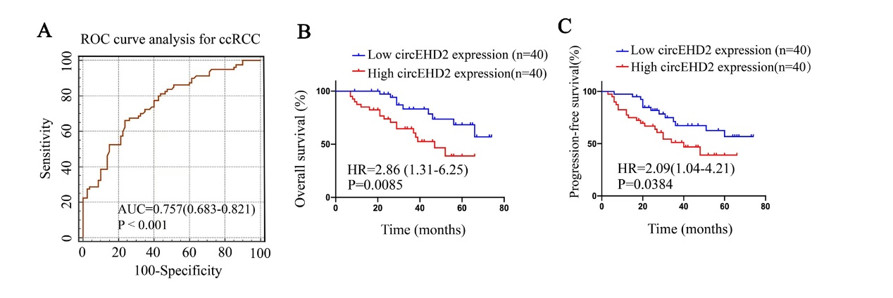 1)circEHD2在肾癌组织以及转移性肾癌的血清外泌体中高表达;而肾癌组织中circEHD2的高表达与患者的不良预后密切相关。