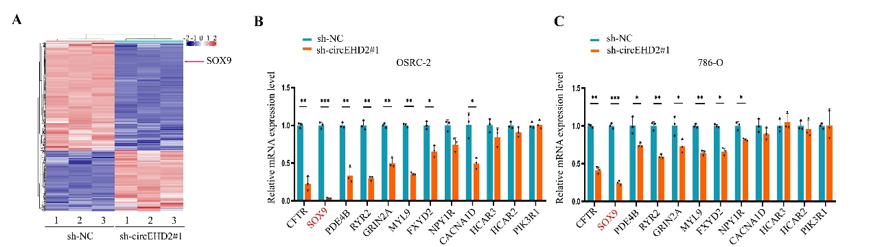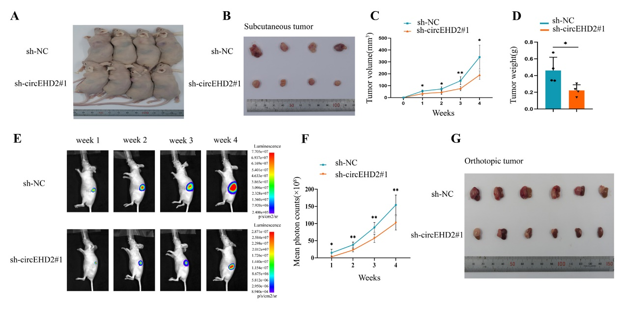 通过对公共数据库GSE100186和GSE108735分析,发现circEHD2在两个数据库中都高表达。同时,研究团队收集80例肾癌患者进行分析,发现circEHD2在癌组织中的表达量高于癌旁组织,并在高分期及高分级的肾癌组织中高表达。肾癌组织中高表达的circEHD2与患者预后不良密切相关。
