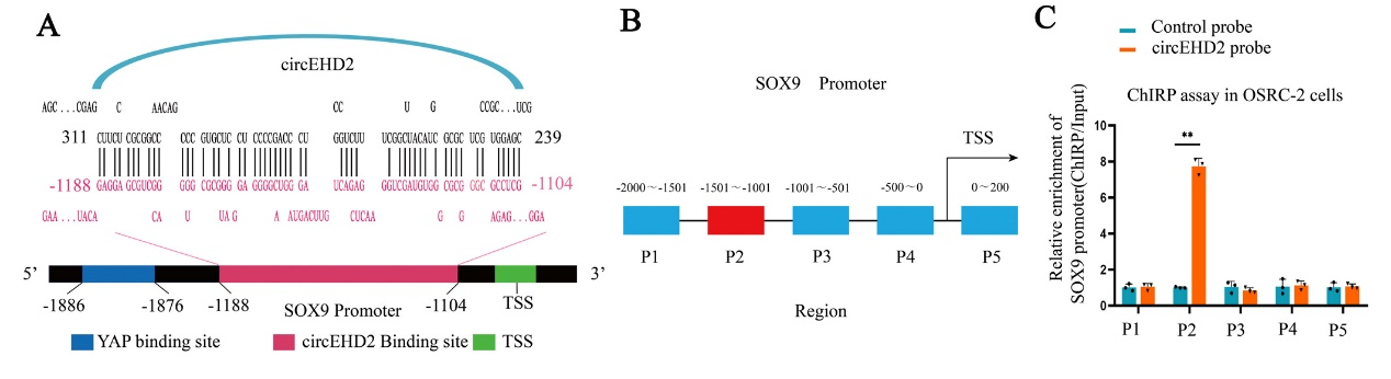 3)circEHD2通过结合YWHAH蛋白后,YWHAH蛋白作为一个桥梁蛋白将circEHD2及转录因子YAP稳定的固定在SOX9的启动子区域,从而促进SOX9的持续高表达,促进肾癌的增殖。