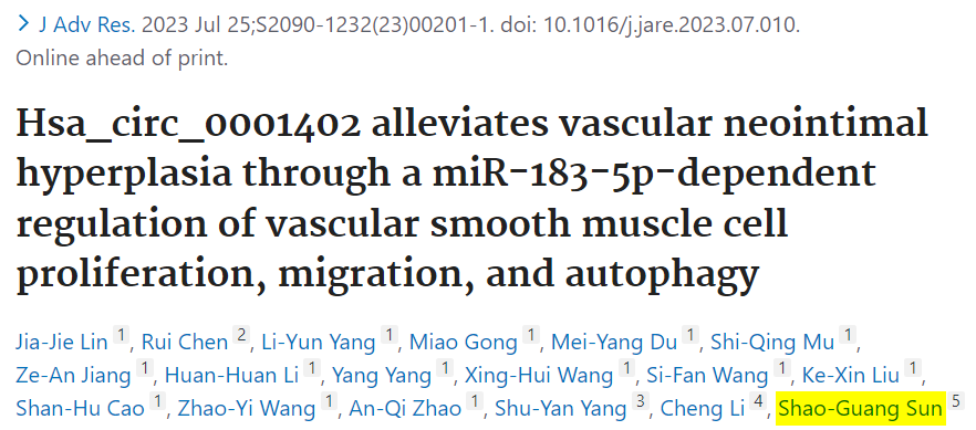 2023年7月25日,《Journal of Advanced Research》(IF=10.7)发表了河北医科大学生物化学与分子生物学教研室孙绍光教授团队的研究论文,题为“Hsa_circ_0001402 alleviates vascular neointimal hyperplasia through a miR-183-5p-dependent regulation of vascular smooth muscle cell proliferation, migration, and autophagy”。该研究率先鉴定了一种可同时调控血管平滑肌细胞(VSMC)增殖、迁移和自噬的circRNA。具体而言,hsa_circ_0001402通过海绵吸附miR-183-5p,靶向FKBPL抑制VSMC增殖和迁移,靶向BECN1激活VSMC自噬,从而抑制血管内膜增生。hsa_circ_0001402/miR-183-5p有望成为血管重构性疾病的干预靶点。