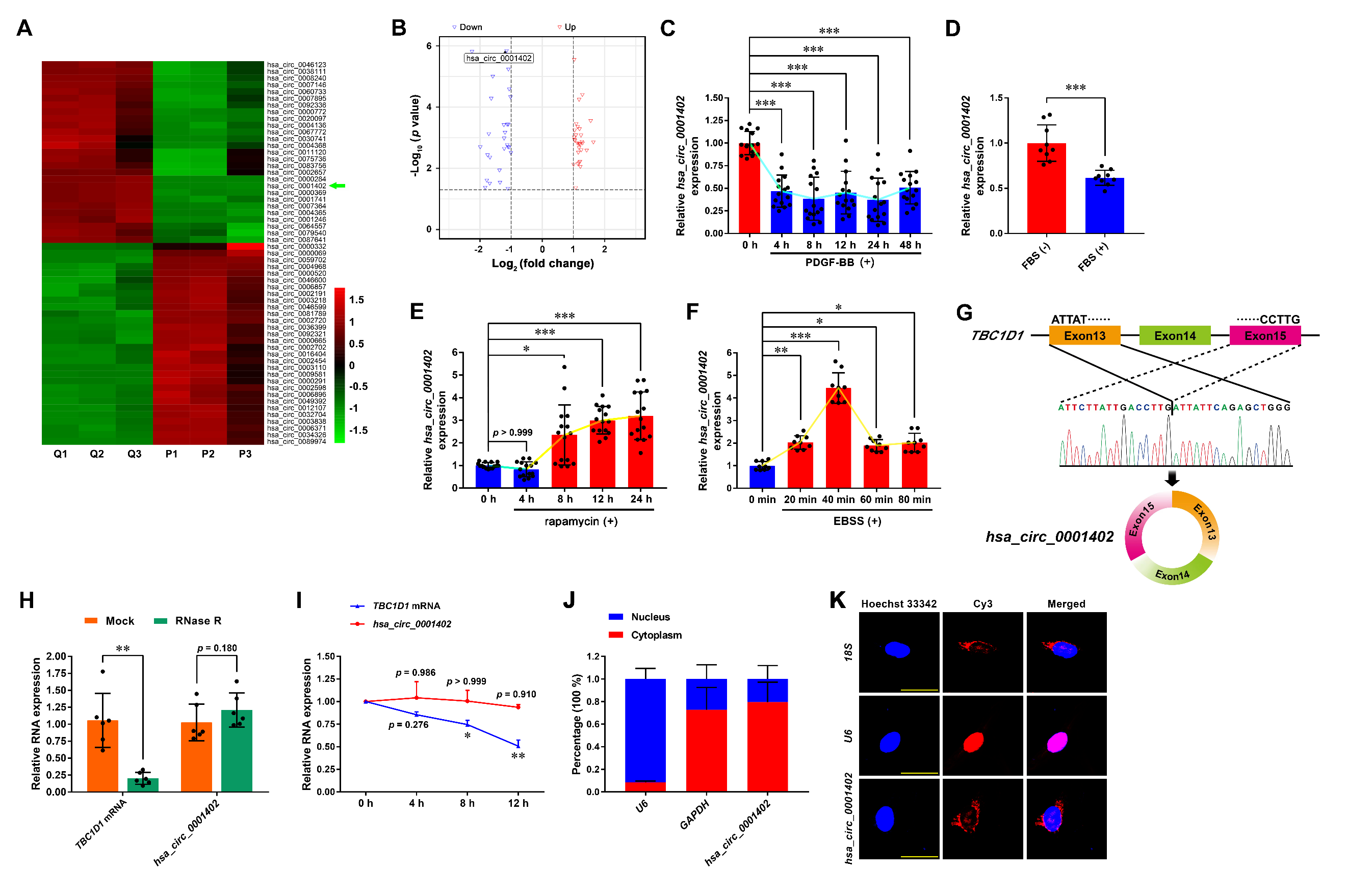 孙绍光教授团队在前期工作中,通过基因芯片在PDGF-BB诱导的VSMC中筛选出134种差异表达circRNA(GSE77278)。其中hsa_circ_0001402在人和小鼠中高度保守,在增殖型VSMC中表达降低(图1A-D)。在诱导自噬的VSMC中,hsa_circ_0001402表达升高(图1D-F)。hsa_circ_0001402由TBC1D1基因的13-15号外显子环化形成(图1G)。联合RNase R和放线菌素D处理实验,证实hsa_circ_0001402的环状性质(图1H-I)。联合核/质RNA检测和RNA FISH检测,证实hsa_circ_0001402主要分布在细胞质中(图1J-K)。