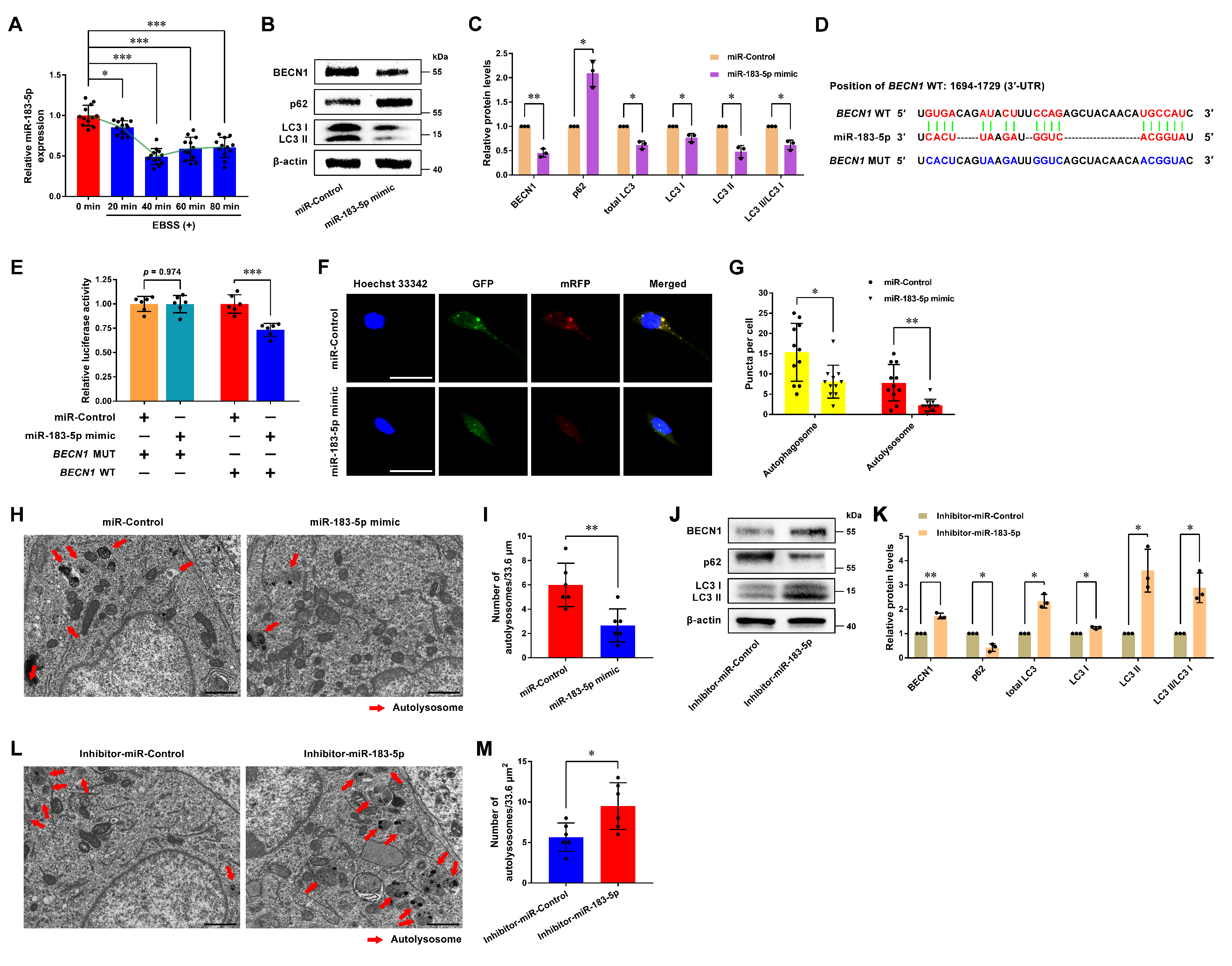 另外,通过生物信息学分析还发现,miR-183-5p能够结合自噬相关BECN1的3′-非翻译区(3′-UTR)。qRT-PCR分析表明,miR-183-5p在诱导自噬的VSMC中表达降低(图3C,4A)。联合Western blot、细胞自噬流检测和透射电镜自噬溶酶体检测,证实过表达miR-183-5p通过靶向BECN1 3′-UTR抑制BECN1蛋白表达水平,从而抑制VSMC自噬(图4B-I)。相反,敲减miR-183-5p能够上调BECN1,从而激活VSMC自噬(图4J-M)。综上,miR-183-5p通过下调BECN1蛋白表达水平,抑制VSMC自噬。