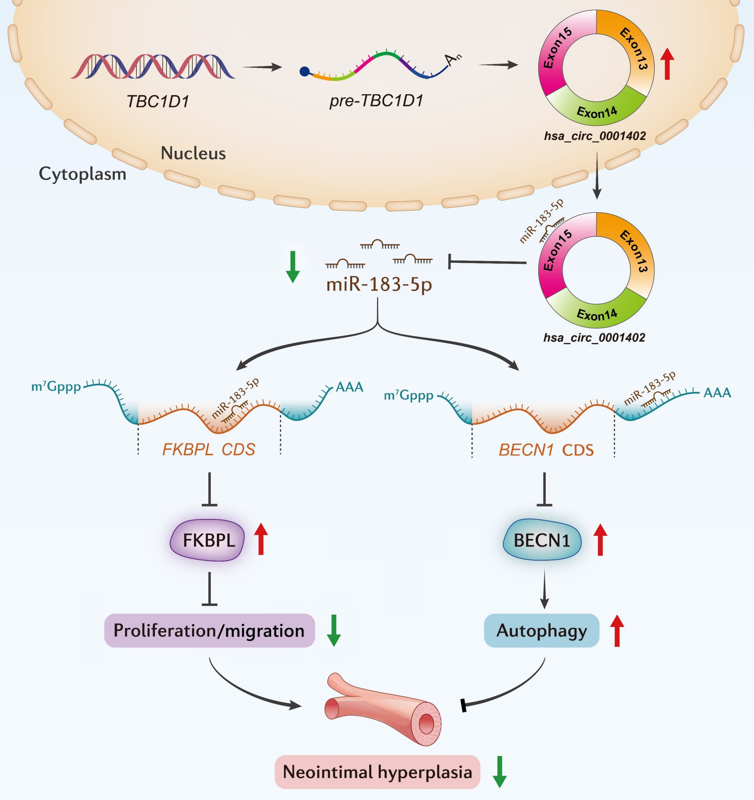 总之,hsa_circ_0001402通过海绵吸附miR-183-5p,同时靶向调控FKBPL和BECN1,二者分别调节VSMC增殖/迁移和自噬,最终协同抑制血管内膜增生。本研究为发掘血管重构相关疾病的治疗靶点提供了新思路。