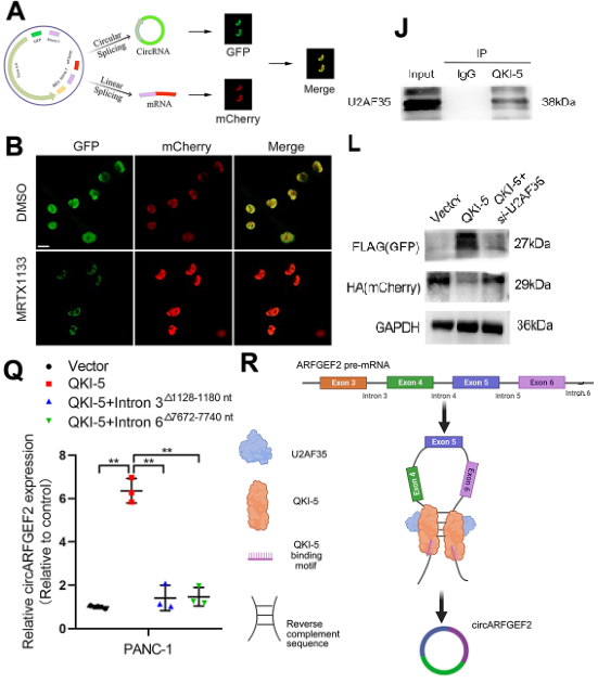 首先,作者通过对PDAC组织和邻近的正常组织(NAT)进行了NGS测序,发现在PDAC组织中有50个circRNA表达上调,其中circARFGF2在KRAS G12D 诱导的PDAC中表达上调最显著。而且,与原发性肿瘤相比,淋巴结转移性PDAC中的circARFGF2具有更高的表达水平,且呈正相关。作者进一步通过RNase R测试等实验证明了circARFGEF2的环状结构具有高度稳定性。通过双色荧光报告法和WB检测结果显示,过表达QKI-5会促进PDAC细胞中circARFGEF2的表达,而敲低QKI-5则减少了circARPGEF2的表达量,表明QKI-5参与了circARFGEF2的生物发生。通过Co-IP和pull-down实验表明,QKI-5募集U2AF35并结合内含子3 1128-1180 nt和内含子6 7672-7740 nt,以调节其前体mRNA剪接而成环。