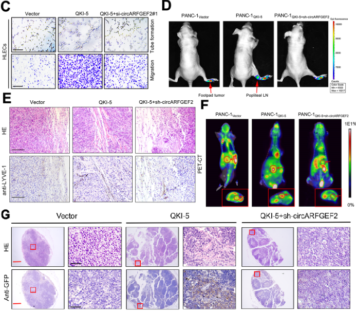 作者通过细胞功能实验发现,KRAS G12D PDAC细胞中的circARFGEF2下调抑制了淋巴管的形成、增殖和迁移能力,而过表达circARFGEF2则产生与之相反的结果。而且,过表达QKI-5增强了淋巴管的形成和迁移能力,但是同时敲低circARFGEF2的表达水平会抑制QKI-5诱导的淋巴管生成。接着,作者运用IVIS和IHC技术和PET-CT扫描检测胰腺中原位肿瘤的葡萄糖代谢水平发现,过表达QKI-5显着促进癌细胞向胰周淋巴结转移,并增加了原位异种移植PDAC小鼠模型中转移性淋巴结数量,但同时敲低circARFGEF2则逆转了该现象。综上表明,QKI-5介导的circARFGEF2环化在体内外促进了KRAS G12D PDAC的淋巴管生成和转移。