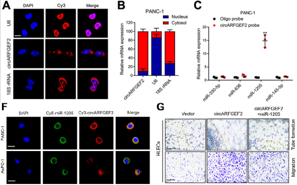 作者运用FISH、核质分离和qPCR检测发现,circARFGEF2主要定位于KRAS G12D PDAC细胞的细胞质中。接着,作者预测到有4个miRNA与circARFGEF2靶向结合,通过RNA pull-down和FISH共定位验证了miR-1205与之结合作用。体外实验表明,过表达circARFGEF2诱发了HLEC管的形成和迁移,而过表达miR-1205明显逆转了这种结果。综上表明,circARFGEF2在KRAS G12D PDAC细胞中充当miR-1205海绵。