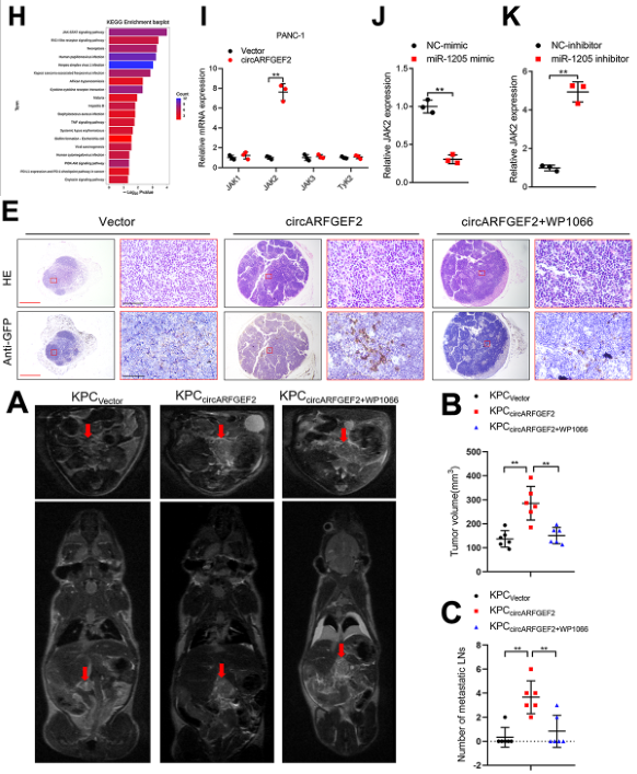 作者通过转录组分析,鉴定出JAK-STAT途径是与circARFGEF2相关的最显著富集的途径。此外,在KRAS G12D PDAC细胞中,JAK2与circARFGEF2的表达水平呈正相关,而miR-1205与JAK2的表达水平呈负相关。WB结果显示,过表达circARFGEF2使JAK2表达水平上调,且增强STAT3磷酸化水平,敲低circARFGEF2则出现相反结果。此外,IHC分析和PET-CT扫描结果显示,使用JAK2-STAT3途径抑制剂WP1066能显著逆转circARFGEF2过表达对淋巴管生成和淋巴结转移的促进作用。综上表明,circARFGEF2通过激活JAK2-STAT3途径促进KRAS G12D PDAC中的淋巴管生成和淋巴结转移。