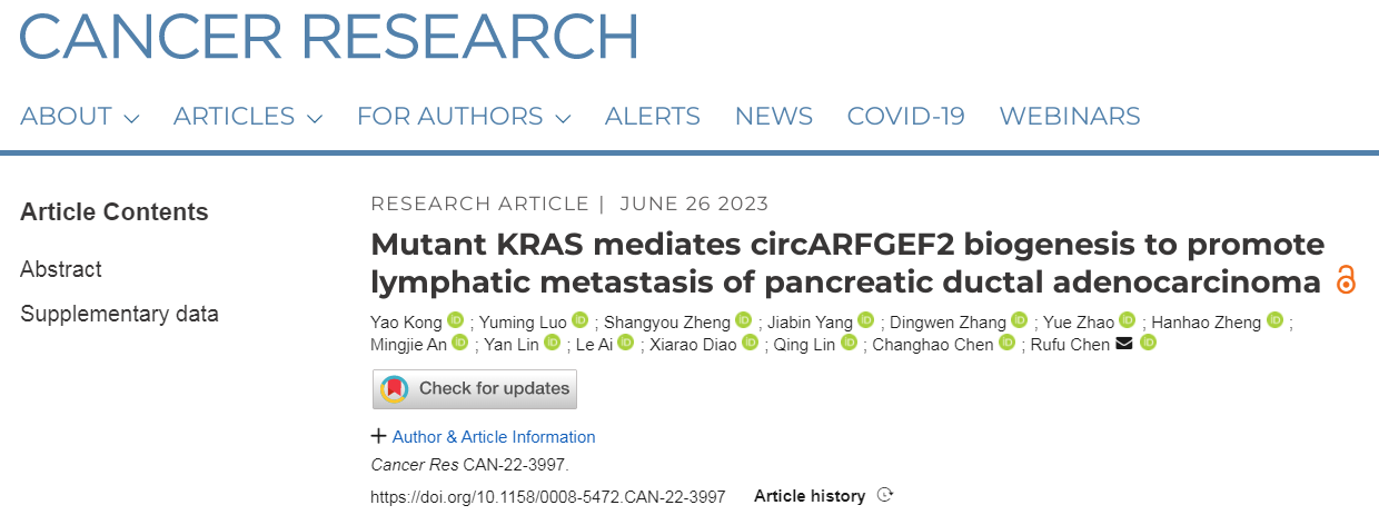 2023年6月26日,广东省人民医院陈汝福教授团队在Cancer Research(IF=11.2)发表文章Mutant KRAS mediates circARFGEF2 biogenesis to promote lymphatic metastasis of pancreatic ductal adenocarcinoma。作者鉴定了一种新的环状RNA——circARFGEF2,发现其在KRAS等位基因G12D突变的PDAC中表达上调,并与KRAS G12D诱导的PDAC淋巴结转移呈正相关,通过体内外实验也证实这一点。研究其机制发现,选择性剪接因子QKI-5能激活circARFGEF2的生物发生,且介导circARFGEF2的miR-1205海绵作用并促进JAK2的激活,进而使STAT3发生磷酸化,最终激活JAK-STAT信号通路,使KRAS G12D诱导的PDAC发生淋巴结转移。综上,本研究阐明了KRAS G12D突变相关的circRNA生物发生机制,并证实了circARFGEF2在KRAS G12D诱导的淋巴结转移性PDAC中具有关键作用,揭示circARFGEF2可作为KRAS G12D诱导的淋巴结转移性PDAC的潜在治疗靶点。