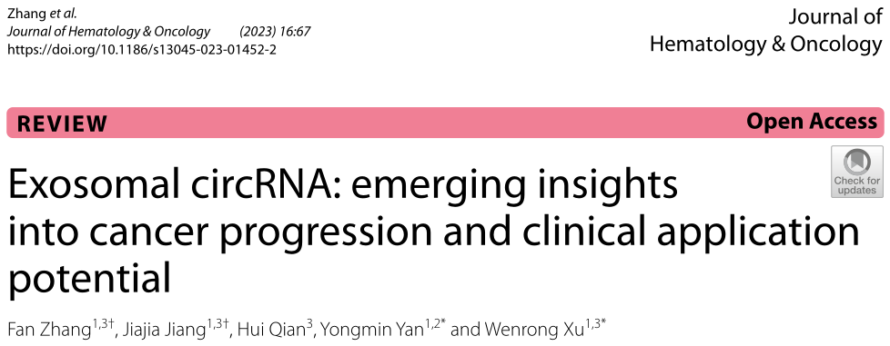 2023年6月26日,江苏大学附属澳洋医院许文荣和严永敏教授团队在Journal of Hematology & Oncology(IF=28.5)上发表题为“Exosomal circRNA:emerging insights into cancer progression and clinical application potential”的综述论文。本文综述了肿瘤细胞和非肿瘤细胞来源的外泌体circRNA在肿瘤进展中的功能和潜在机制,特别关注其在肿瘤免疫和代谢中的作用。此外,作者阐述了外泌体circRNA作为诊断生物标志物和治疗靶点的潜能,强调了其在临床上的应用前景。