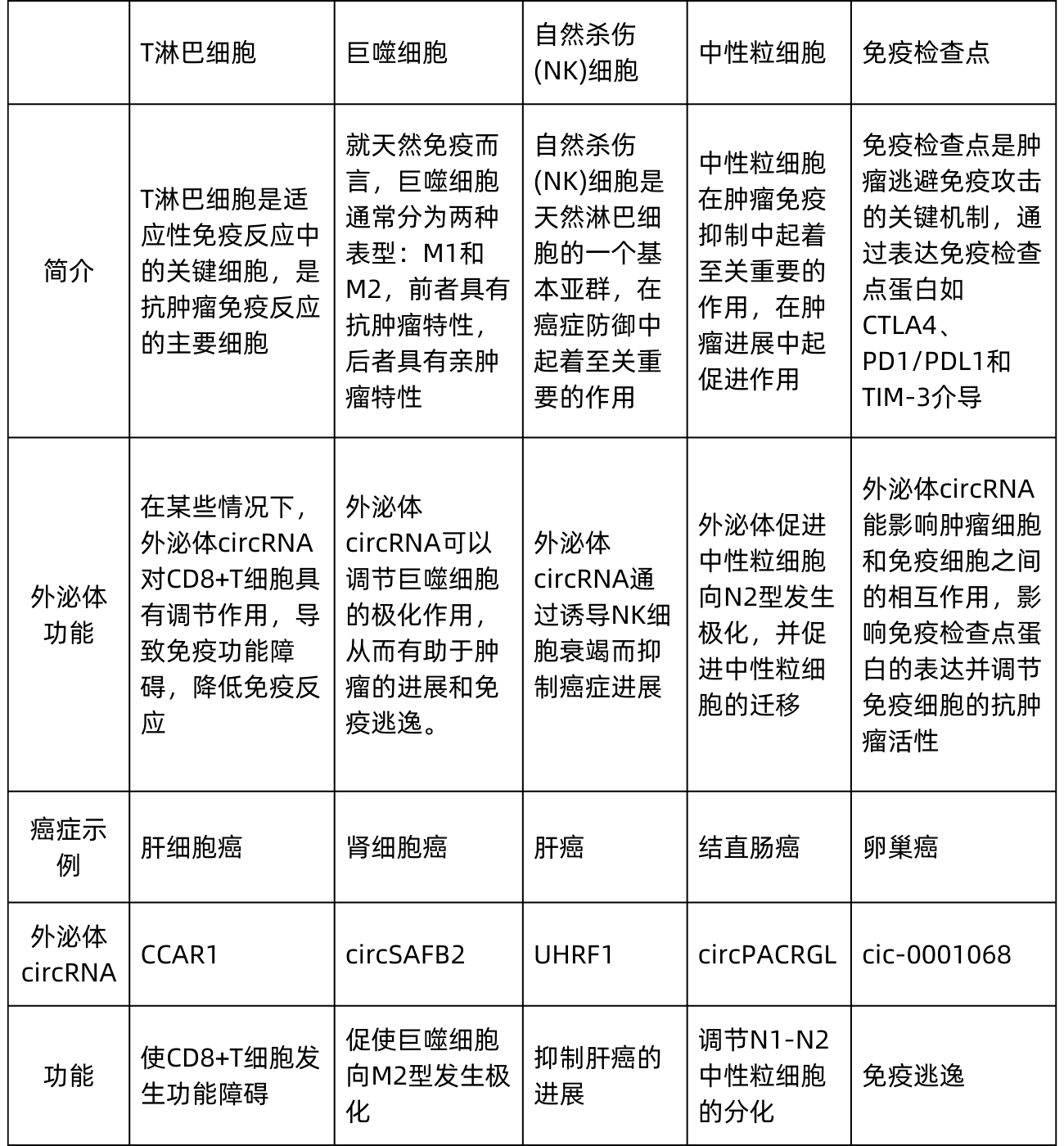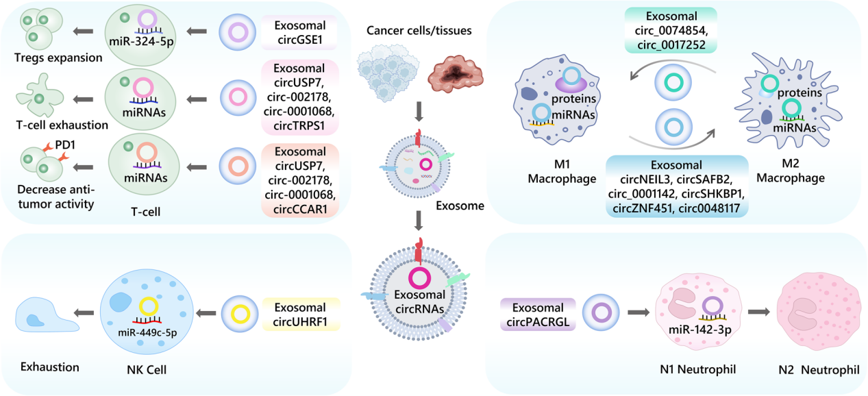 图1 肿瘤来源的外泌体circRNA在T细胞、巨噬细胞、NK细胞和中性粒细胞等免疫细胞中的作用