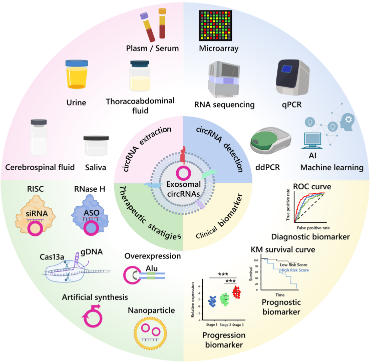 外泌体circRNA具有许多优点,如高稳定性、高丰度和长半衰期等,而且存在于人体体液中(包括血浆、血清和尿液)。外泌体circRNA在肿瘤组织中异常表达,已被证明与各种癌症的进展和临床特征有关,可以作为癌症的早期诊断和预后标志物。