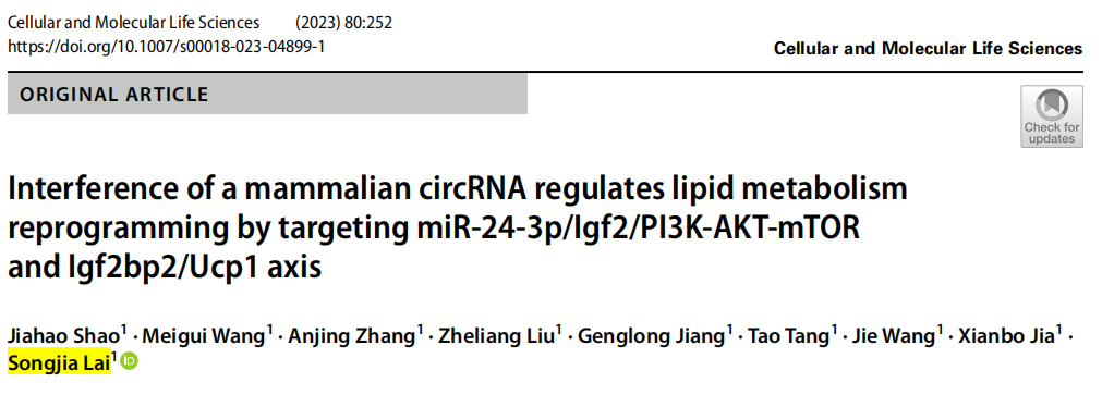 2023年8月17日,《Cellular and Molecular Life Sciences》(IF=8.0)发表了四川农业大学动物科技学院赖松家教授团队的研究论文,题为“Interference of a mammalian circRNA regulates lipid metabolism reprogramming by targeting miR-24-3p/lgf2/Pl3K-AKT-mTOR and lgf2bp2/Ucp1 axis”。该研究报道了一种在肥胖动物个体中异常高表达的circRNA,即mmu_circ_0001874。机制上,mmu_circ_0001874海绵吸附miR‑24‑3p,靶向调节Igf2,进而影响下游PI3K‑AKT‑mTOR信号通路。此外,mmu_circ_0001874通过RNA结合蛋白Igf2bp2促进Ucp1表达。该研究强调了circRNA在脂质代谢重编程中的作用,并提示mmu_circ_0001874/miR-24-3p/lgf2/PI3K-AKT-mTOR和mmu_circ_0001874/Igf2bp2/Ucp1轴可能是调控动物脂质沉积的潜在机制。