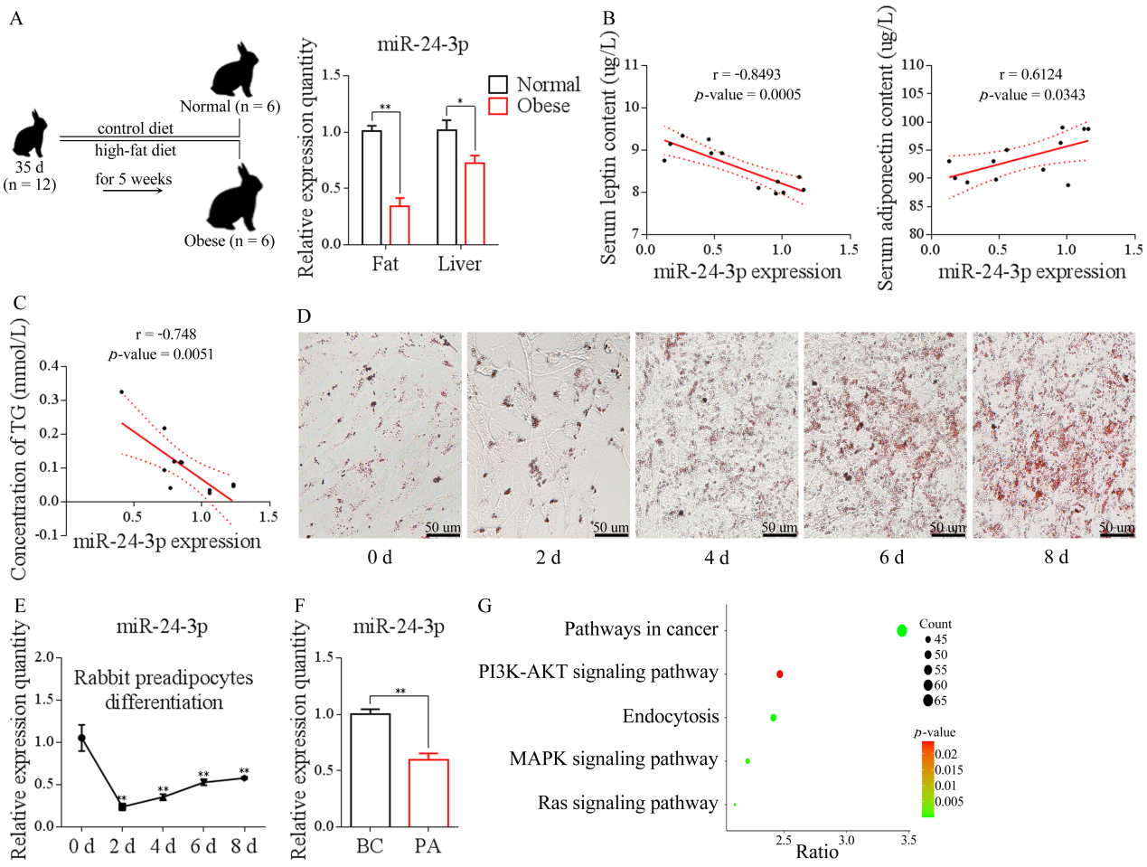 使用团队前期的研究材料,作者发现miR‑24‑3p在肥胖家兔的脂肪和肝脏组织中表达下调(图1A)。其中,脂肪组织miR‑24‑3p表达与血清瘦素水平负相关,而与脂联素正相关(图1B)。在肝脏组织中,miR‑24‑3p表达与肝脏甘油三酯水平负相关(图1C)。通过细胞培养,作者发现miR‑24‑3p在前体脂肪细胞转化为成熟脂肪的过程与棕榈酸处理的成熟脂肪细胞中下调(图1D-F)。此外,KEGG分析揭示前5的靶基因集显著富集于癌症、PI3K-AKT信号通路、内吞作用、MAPK信号通路、以及Ras信号通路(图1G)。
