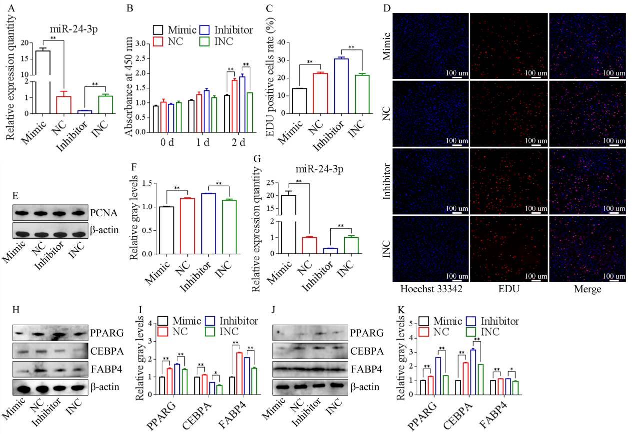 在细胞水平,作者使用miR‑24‑3p mimic和inhibitor来研究miR‑24‑3p对前体脂肪细胞增殖和分化的影响。在细胞增殖的背景下,转染效率被测定(图2A)。同时,miR-24-3p mimic处理显著抑制前体脂肪细胞增殖,而这一结果在miR-24-3p inhibitor组则反之(图2B-F)。对于细胞分化,作者测定了miR-24-3p mimic和inhibitor的转染效率以确定转染的有效性(图2G)。免疫印迹实验显示,miR-24-3p mimic抑制了细胞内分化标志基因PPARG、CEBPA、FABP4的表达,而miR-24-3p inhibitor促进其表达(图2H-K)。