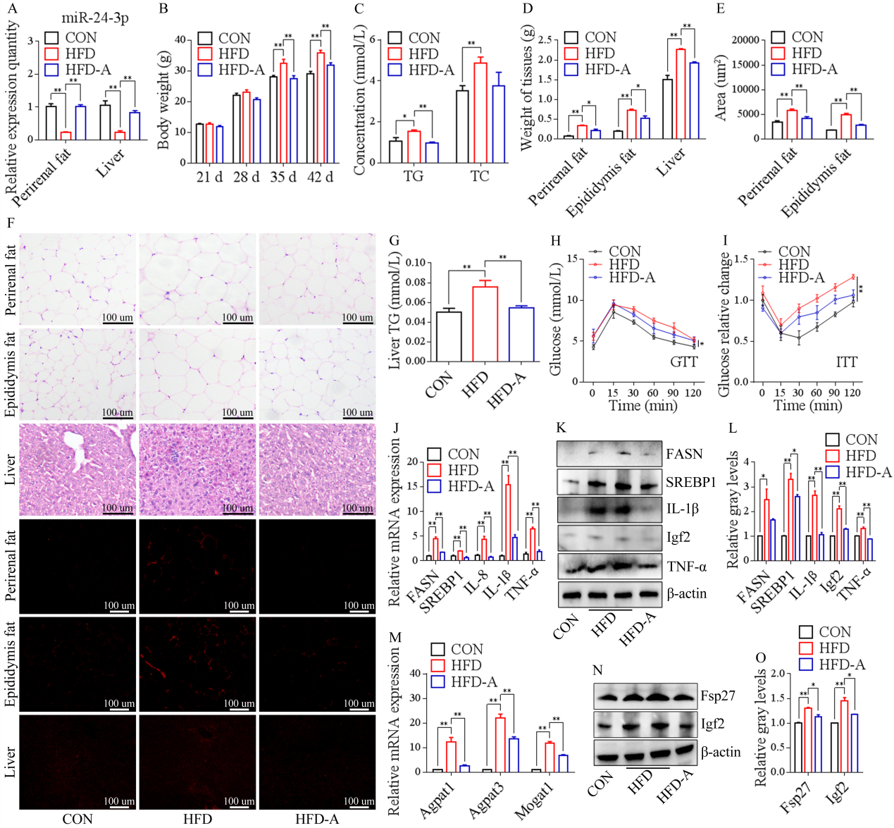 接下来,作者进一步研究了miR-24-3p在动物体内参与脂质代谢的作用。通过尾静脉注射miR-24-3p体内激动剂同时饲喂高脂饮食建立动物模型(图3A)。结果显示,在高脂饮食的背景下,miR-24-3p过表达抑制了动物的体重增长(图3B),血脂(图3C),脂肪和肝脏重量(图3D),脂肪细胞横切面积(图3E),组织炎症因子(图3F),肝脏甘油三酯含量(图3G),改善了GTT(图3H)和ITT(图3I)。在脂肪和肝脏组织中,荧光定量和免疫印迹实验揭示miR-24-3p过表达抑制了脂代谢相关因子和炎症相关因子的表达(图3J-O)。