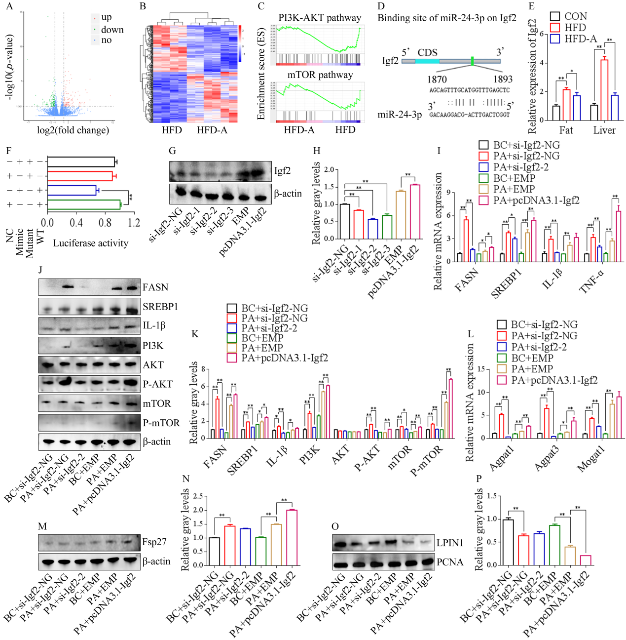 作者通过测序获得了脂肪中的mRNA表达变化(图4A-4B)。KEGG-GSEA分析揭示PI3K-AKT和mTOR通路在组间富集(图4C)。其中,Igf2由于其与脂肪生理、脂质代谢、肥胖等相关,进而被选为关键基因用于进一步研究。RNA22网站分析miR-24-3p和Igf2之间的结合位点,再通过定量验证Igf2在miR-24-3p过表达动物中的表达(图4D-E)。双荧光素酶报告实验验证了两者之间的结合(图4F)。接下来,筛选出高效率的siRNA和过表达载体(图4G-H)Igf2干扰抑制脂代谢和炎症相关因子的表达而Igf2过表达则反之(图4I-N)。此外,作者还发现Igf2干扰抑制了AKT和mTOR的磷酸化而Igf2过表达则促进其磷酸化(图4J-K)。作为PI3K-AKT-mTOR下游的LPIN1基因,Igf2干扰则促进了其核内表达,而Igf2过表达则抑制核内LPIN1表达(图4O-P)。