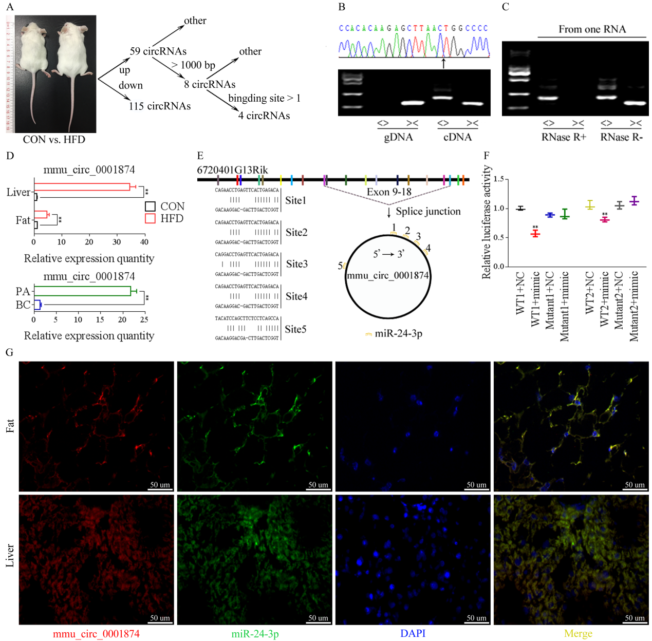 鉴于miR-24-3p在肥胖动物脂肪和肝脏中保持着较低的丰度,作者试着寻找一个上游circRNA,其可以作为miR-24-3p的分子海绵并参与脂质代谢。通过转录组测序,174个差异circRNA被鉴定。在上调的circRNA中,有22个circRNA与miR-24-3p具有结合位点,其中,mmu_circ_0001874含有5个位点(图5A)。通过收敛引物和发散引物扩增,作者发现mmu_circ_0001874是一个具有“首尾结合”序列的circRNA(图5B-C)。并且,在细胞和动物中,mmu_circ_0001874表达在脂质沉积后增强(图5D)。双荧光素酶报告分析实验验证了结合位点(图5E-F)。同时,FISH实验证明两者具有一致的细胞定位(图5G)。