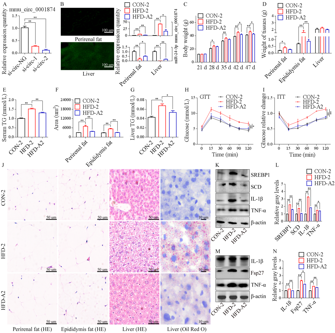 接下来,作者筛选出干扰效率较高的siRNA并进行腺病毒载体构建(图6A-B)。同时,动物实验表明mmu_circ_0001874的缺失抑制了动物的体重增长(图6C),脂肪和肝脏重量(图6D),血脂(图6E),脂肪细胞横切面积(图6F),肝脏甘油三酯含量(图6G),脂肪和肝脏组织脂质含量(图6J),并改善GTT(图6H)和ITT(图6I)。此外,在脂肪和肝脏中,mmu_circ_0001874的缺失阻碍了高脂饮食介导的脂代谢相关因子和炎症相关因子的表达增加(图6K-N)。