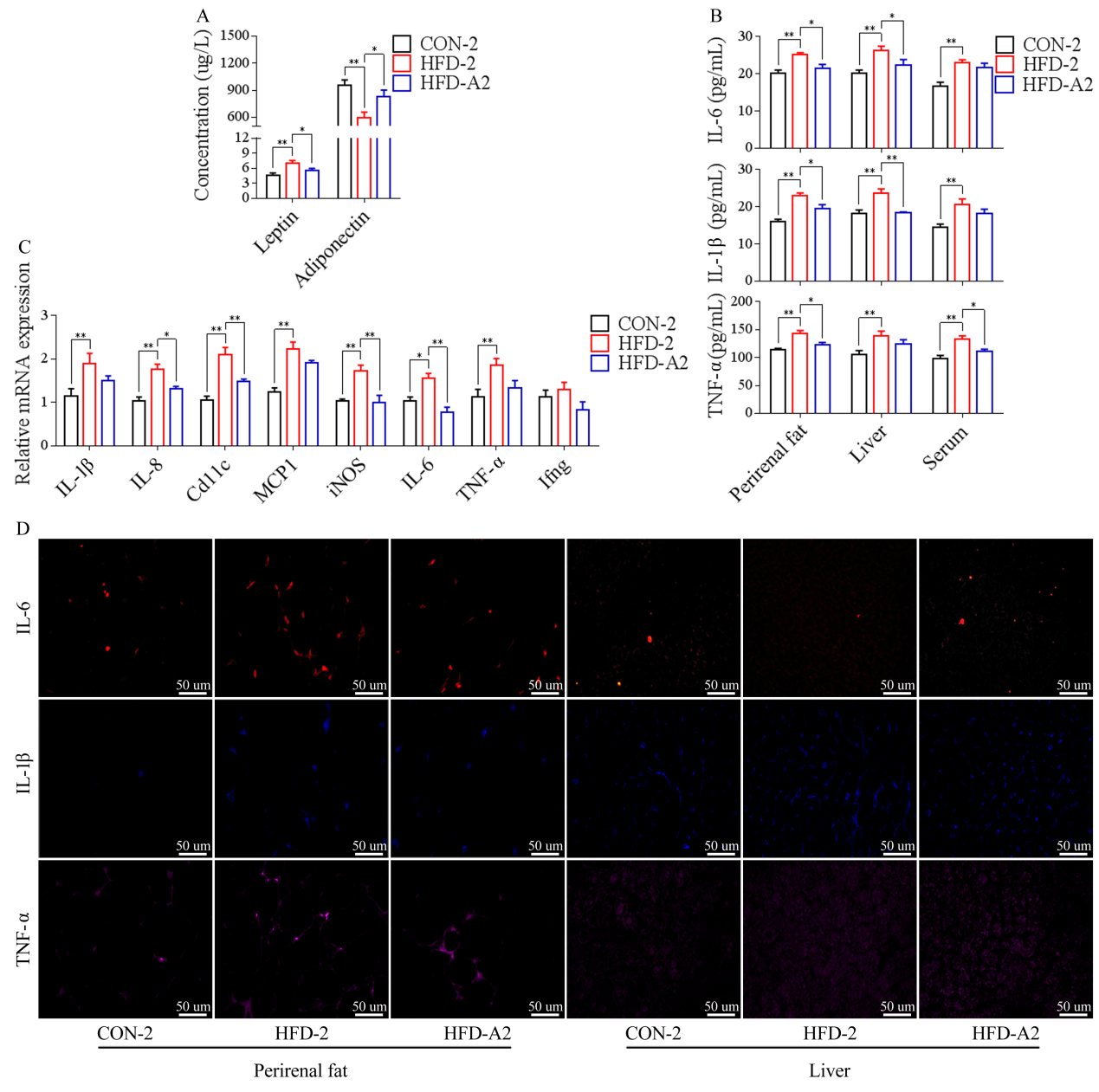 在动物血清中,作者发现mmu_circ_0001874缺失降低了循环瘦素水平但是增加了脂联素的含量(图7A)。在肥胖动物脂肪、肝脏和血清中,mmu_circ_0001874的缺失降低了促炎因子TNF-α、IL-1β、IL-6(图7B)。针对脂肪组织的荧光定量分析也表明促炎基因在mmu_circ_0001874缺失后表达下调(图7C)。此外,免疫荧光验证了之前的结果(图7D)。
