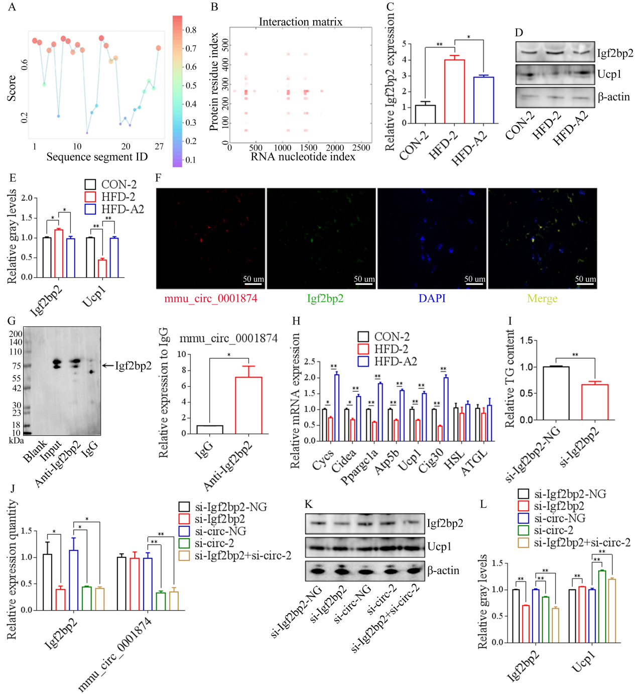 这里,作者利用RBPsuite和catRAPID数据库发现Igf2bp2可能在多个位点结合mmu_circ_0001874(图8A-B)。当mmu_circ_0001874缺失时,Igf2bp2的表达发生逆转(图8C-E)。mmu_circ_0001874和Igf2bp2之间存在较好的共定位(图8F)。RIP实验显示Igf2bp2可以富集mmu_circ_0001874(图8G)。接下来,作者发现mmu_circ_0001874缺失增加了线粒体基因(图8H)。Igf2bp2干扰后细胞脂质积累较少(图8I)。此外,mmu_circ_0001874的缺乏导致Igf2bp2表达下降,但Igf2bp2基因沉默不影响mmu_circ_0001874的表达,这表明Igf2bp2不调节mmu_circ_0001874的稳定性,但可能与mmu_circ_0001874相互作用调节脂质代谢(图8J)。PAR-CLIP测序分析显示存在多个Igf2bp2靶mRNA。其中,产热基因Ucp1也是Igf2bp2的靶mRNA。证据表明,Igf2bp2结合Ucp1 mRNA并抑制其翻译。通过共转染,mmu_circ_0001874缺失显著提高了Igf2bp2基因沉默诱导的Ucp1表达(图8K-L)。