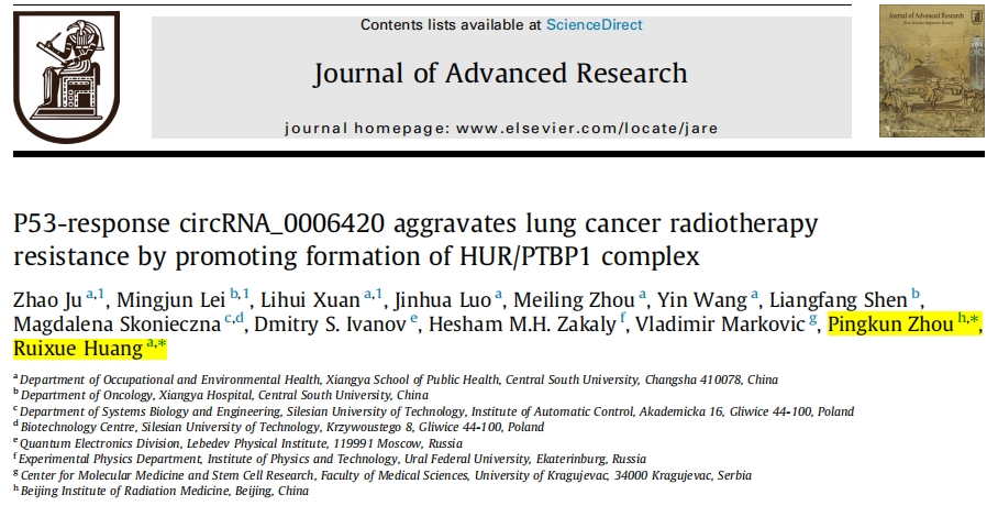 2023年8月2日,中南大学湘雅公共卫生学院黄瑞雪教授以及北京放射医学研究所周平坤教授以共同通讯作者在Journal of Advanced Research(IF=10.7)发表文章“P53-response circRNA_0006420 aggravates lung cancer radiotherapy resistance by promoting formation of HUR/PTBP1 complex”。研究结果表明,依赖于p53的circRNA_0006420(IRSenss)可以调节细胞周期阻滞和电离辐射诱导的EMT进展,影响A549细胞对电离辐射的敏感性。当p53存在时,经辐射后,IRSense的过表达促进了辐射耐受性;然而,当p53被敲掉时,辐射后IRSense的表达被抑制,则显示辐射敏感性。此外,作者也证明IRSense可以作为促进HUR/PTBP1复合物形成的支架。从机制上来讲,当p53存在时,IRSenss在电离辐射后定位于细胞核,并与RNA结合蛋白HUR相互作用,以阻止宿主PTBP1 mRNA的核输出,随后抑制其表达以促进辐射敏感性。本研究进一步阐述了circRNA在调节电离辐射效果中的作用,为临床肺癌治疗提供了新途径。