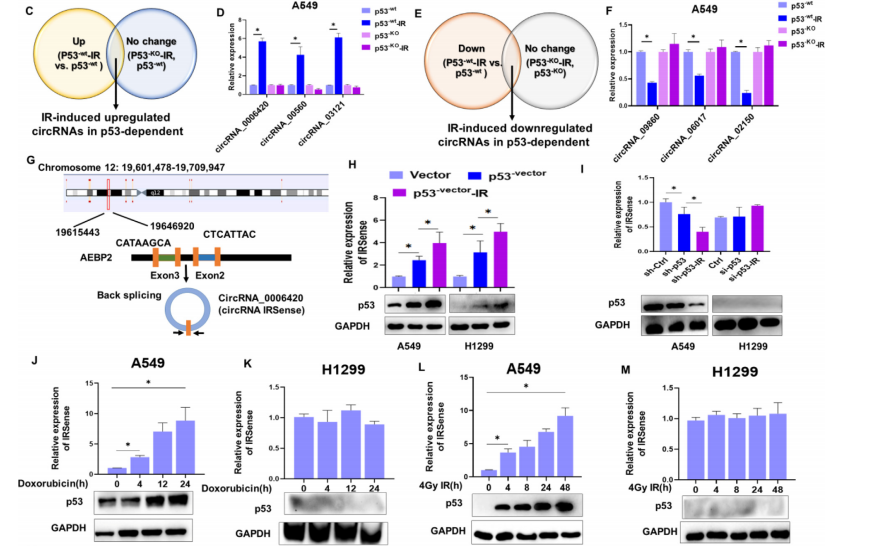 首先作者将A549细胞分为p53-wt、p53-KO、p53-wt-IR和p53-KO-IR,探索响应p53的circRNA,并且使用RNA-seq对circRNA进行测序验证。通过差异比对分析,发现IRSense是在电离辐射后表达水平上升最多的circRNA。在电离辐射后,IRSense在p53-wt细胞中表达水平上调,而在p53-KO细胞内表达水平没有发生变化;同时,在A549细胞中过表达野生型的p53或使用阿霉素激活DDR,两种方式均会增加IRSense的表达水平。结果表明p53会调控电离辐射后IRSense的表达(如图1)。