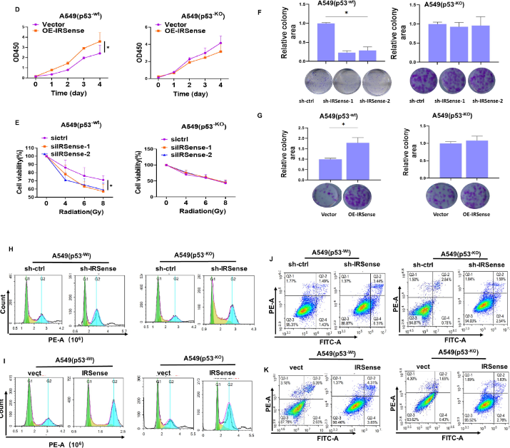 随后作者评估了IRSense在有无p53情况下的细胞增殖和针对电离辐射敏感性中的作用。实验结果显示,当p53存在时,过表达IRSense增加了p53-wt细胞的增殖,而IRSense基因的下调则相反。集落形成实验显示,IRSenss的敲低降低了p53-wt A549细胞的集落面积,但没有降低p53-KO A549细胞的集落面积。细胞周期分析实验显示,与p53-KO A549细胞相比,p53-wt A549细胞中IRSense敲低影响了细胞周期。凋亡实验显示,与p53-KO A549细胞相比,IRSense的下调显著提高了p53-wt A549细胞的凋亡率。这些结果表明,p53存在的情况下,辐射后IRSense的表达增加,导致G2/M阻滞并抑制细胞凋亡,从而导致肺癌细胞出现辐射耐受性(如图2)。