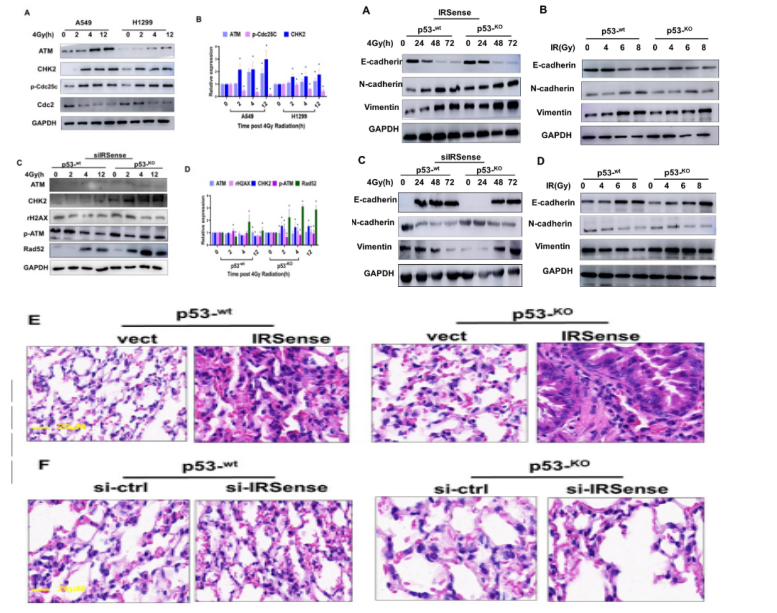 接着,作者验证了在p53存在的情况下,辐射后IRSense的上调与DDR通路相关蛋白的关系。实验结果显示,在4 Gy辐射下,A549细胞中ATM、CKH2和p-cdc25c水平升高,cdc2水平下降,且呈时间依赖性。结果表明,IRSense以p53响应的方式调节DDR相关蛋白以应对辐射损伤。此外,作者研究了IRSense和EMT的关系。WB实验显示在4Gy辐射处理后,与p53-KO A549细胞相比,IRSense的下调增加了p53-wt A549细胞中的E-cadherin表达水平,但降低了N-cadherin和viment的表达,且呈时间依赖性。肺组织的H&E染色显示,注射siIRSense的p53-wt-siIRSense-IR小鼠的炎症浸润和胶原纤维沉积减少。这些结果表明,在p53存在的情况下,IRSense的过表达促进了电离辐射诱导的EMT(如图3)。