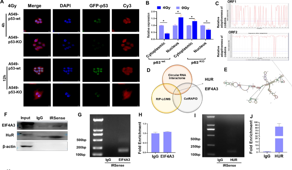 作者上述探讨了IRSense介导的辐射诱导细胞G2/M阻滞和EMT的分子机制。作者通过RNA-FISH发现,IRSense定位于细胞质,在4 Gy辐射后转移到细胞核,并与p53共定位。通过生信分析,作者预测了IRSense的结构;发现IRSense可以形成RNA蛋白复合物,IRSense可能会与HuR蛋白结合。通过RIP联合LC/MS分析显示IRSense在A549细胞中和HUR会相互作用。此外,作者通过RNA pull-down实验证明RPD-1是最有可能的HUR结合位点。这些结果表明,在p53存在的情况下,IRSense在电离辐射后从细胞质转移到细胞核,并与HUR相互作用(如图4)。