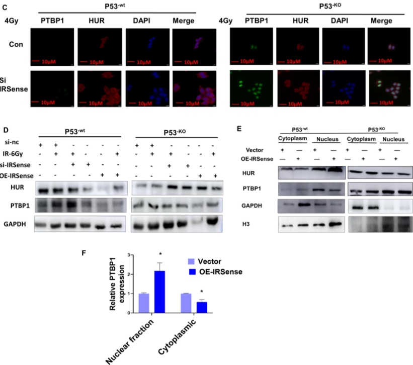 此外,作者通过生信分析推测IRSense/HUR/PTBP1复合物具有调控功能。通过RNA-FISH分析表明p53-wt A549细胞经4 Gy辐射处理后,敲低IRSense会抑制HUR从细胞质向细胞核转移。辐射处理后,IRSense的敲低不影响PTBP1的表达。PTBP1是一个与mRNA输出相关的剪接因子。因此,作者推测IRSense/HUR复合物会调控PTBP1 mRNA的输出。通过WB以及qPCR检测表明,在过表达IRSense的细胞内,细胞核内HUR蛋白和mRNA表达水平升高。RIP实验证明HUR在A549细胞中与IRSense和PTBP1 mRNA相互作用。这些结果表明,在p53存在的情况下,经过辐射处理后,过表达IRSense会促进HUR和PTBP1停留在细胞核内(如图5)。