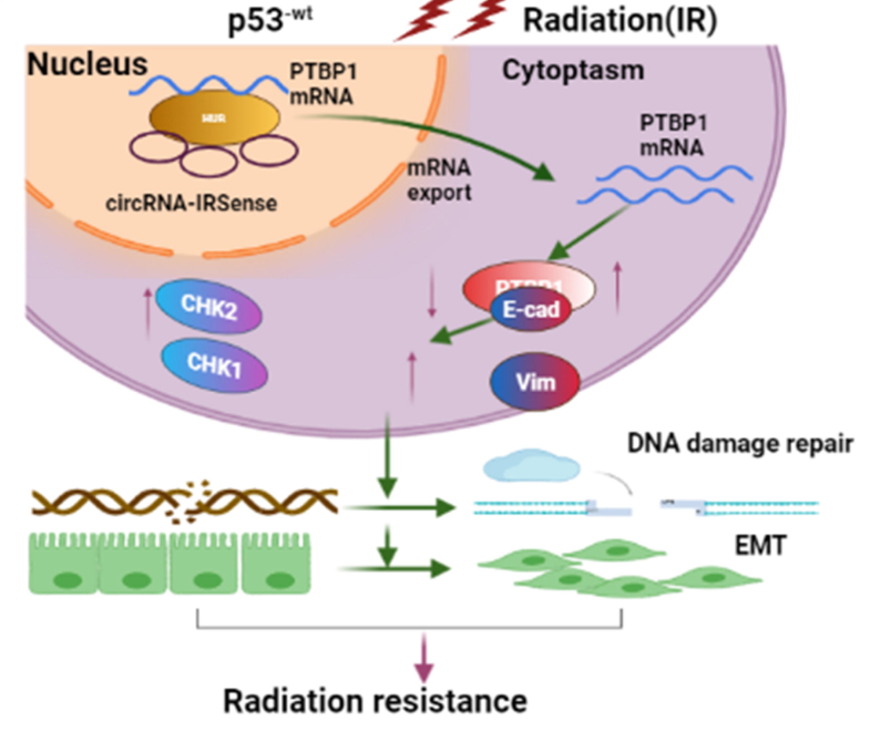 综上所述,作者发现在电离辐射后,IRSense在p53-wt细胞中表达上调,但在p53-KO细胞内没有发生变化,说明p53会调控IRSense的表达。在p53存在时,辐射后IRSense的上调通过调节DDR通路相关蛋白诱导G2/M阻滞;同时,辐射后IRSense的上调也会促进辐射诱导EMT。本研究进一步加深了对circRNA在调节电离辐射效果中的作用,为有效的临床肺癌治疗提供了新的途径。