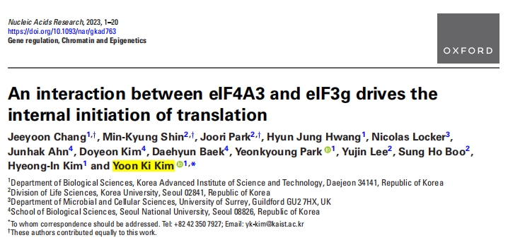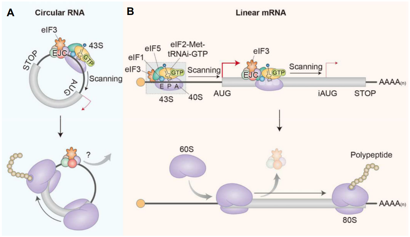 研究小组发现了eIF3g(eIF3复合物的一个亚基)是eIF4A3的结合伴侣,eIF4A3是外显子连接复合物(EJC)的核心成分,EJC沉积在剪接的mRNA上,在基因表达调控中发挥多种作用。eIF4A3-eIF3g之间的直接相互作用可作为eIF4A3和eIF3复合物之间的分子连接体,从而促进内部核糖体的进入。体外合成的circRNA的蛋白合成表明,eIF4A3驱动的内部翻译依赖于eIF4A3-eIF3g的相互作用。此外,全转录组分析表明,内源性circRNA的高效多聚体关联需要eIF4A3。值得注意的是,一部分内源circRNAs能以依赖eIF4A3的方式表达全长完整蛋白,如β-catenin。综上所述,研究结果拓展了对包括circRNAs在内的人类转录组蛋白编码潜能的理解。