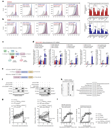 GSDMD的N端可插入内膜,以肌醇和心磷脂为目标,形成孔,从而破裂质膜。为了选择性地诱发癌细胞的膜毒性,作者组装由HRV2 IRES驱动的GSDMDNT IVT mRNA(图1e)。为了消除真核细胞内内源性GSDMD表达和其他IFs/ITAFs的干扰,作者构建了原核细胞表达和纯化系统。通过电转染将GSDMDNT IVT mRNA和过表达质粒pAOX1-EIF4G2和pHT43-PTBP1导入富含心磷脂的枯草芽孢杆菌中。结果显示,eIF4G2+/PTBP1+肿瘤细胞中,HRV2 IRES可以驱动原核细胞中GSDMDNT mRNA的表达,诱导心磷脂膜毒性(图1f-i)。