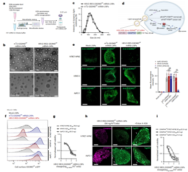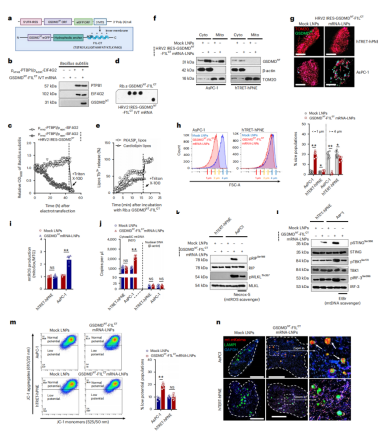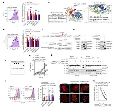 使用微流控芯片装置,按照DLin-MC3-DMA、DSPC、胆固醇和peg-脂质的标准脂质配方将HRV2 IRES-GSDMDNT mRNA-LNPs封装在LNPs中(平均直径为100nm),随后递送到eIF4G2+/PTBP1+癌细胞系,以诱导GSDMD依赖性的焦亡(图2a-d)。