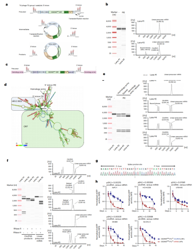 作者使用内含子-外显子(PIE)剪接策略构建环状RNA。具体方法在于:利用T4噬菌体胸苷酸合成酶基因的I型内含子将其与中间断开,将内含子2和内含子1顺序连接。然后将HRV2 IRES、GSDMDc .825 T>A/c.884 A>G ORF、eGFP ORF和F1LCT依次插入到内含子之间。用IVT合成前体RNA,然后加入Mg2+和GTP进行催化环化(图5a)。然而,PIE环化策略未能产生环化产物(图5b)。