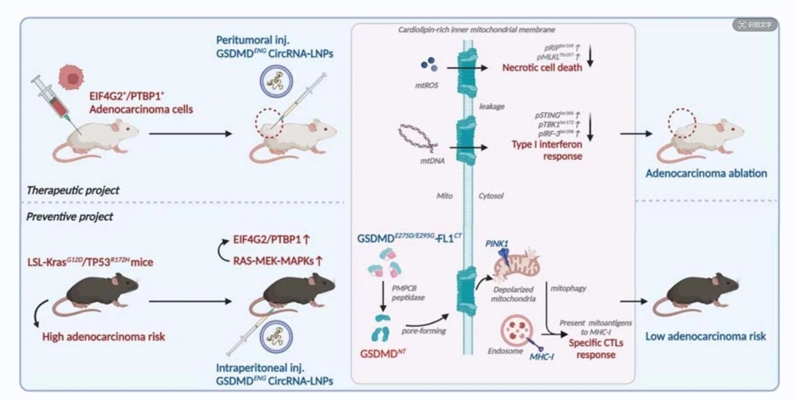 本研究利用内含子-外显子(PIE)剪接环化策略和脂质纳米颗粒(LNP)包装方法(二者能降低mRNA的免疫原性),将人鼻病毒2型(HRV2)内部核糖体进入位点(IRESs,可触发序列在癌细胞 (EIF4G2 和 PTBP1高表达)中翻译),hGSDMDc .825 T>A/c.884 A>G-F1LCT突变mRNA序列(具备线粒体内膜心磷脂靶向毒性,触发线粒体吞噬,溶解并杀伤肿瘤细胞),组装成GSDMDENG环状RNA。体内实验结果显示,GSDMDENG环状RNA可抑制EIF4G2+ /PTBP1+泛腺癌的发展。并且,非常值得关注的是,在KRASG12D突变引起EIF4G2和PTBP1异常的肿瘤模型中,GSDMDENG环状RNA可显著抑制胰腺、肺和结肠腺癌的发生,提高了生存率,诱导了KRASG12D肿瘤抗原特异性细胞毒性T淋巴细胞反应。