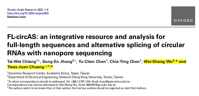 很快,在2023年10月12日,Nucleic Acids Research(IF=14.9)再一次刊发了关于纳米孔全长环状RNA的文章“FL-circAS: an integrative resource and analysis for full-length sequences and alternative splicing of circular RNAs with nanopore sequencing”,该研究成果由台湾省中央研究院的庄树谆教授团队分享。
