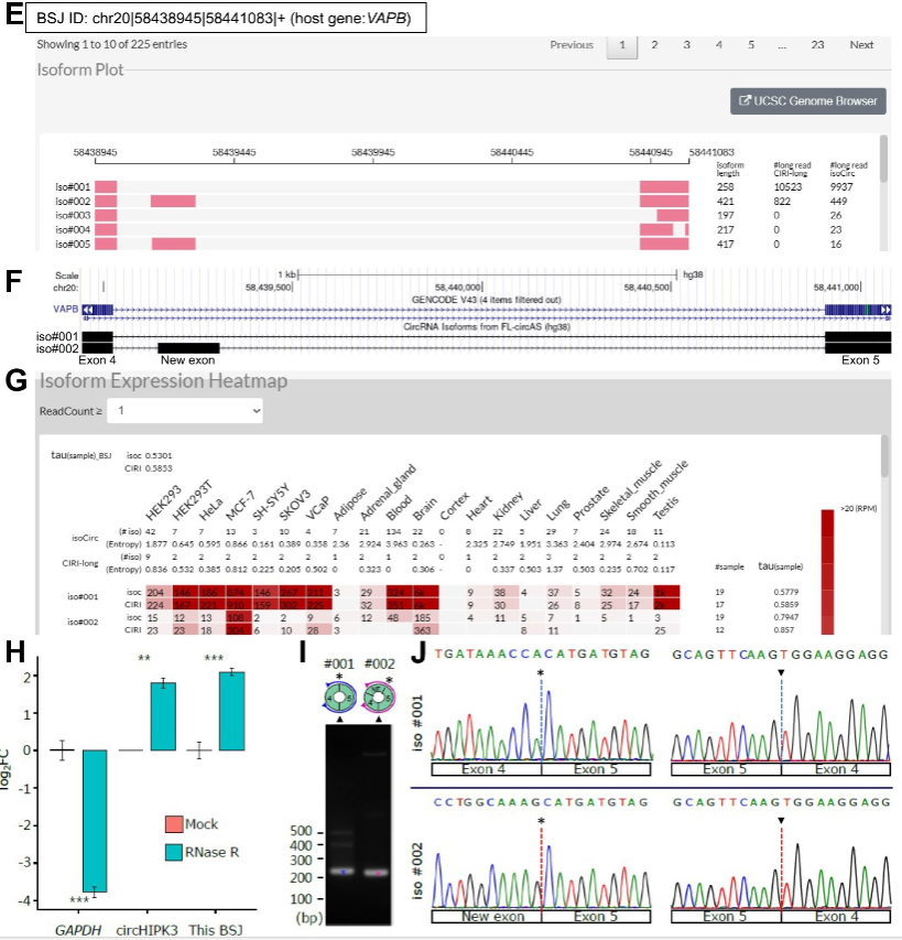 第二个案例是来源于VAPB基因的chr20|58438945|58441083|+,该BSJ在MCF-7细胞中具有很高的AS信息熵,包含两个高表达的 isoforms(iso#001、iso#002),其中iso#001与 VAPB的外显子一致,而iso#002却存在外显子跳跃(图4E~G)。该BSJ没被验证过,因此,作者对 MCF-7细胞进行RNase R处理,发现该BSJ能够耐受RNase R(图4H);通过PCR-Sanger测序证实了两个isoforms的存在(图4I,J)。