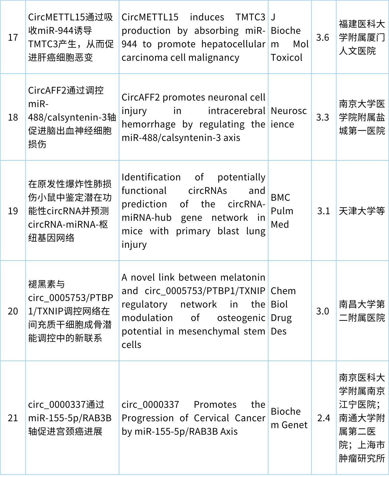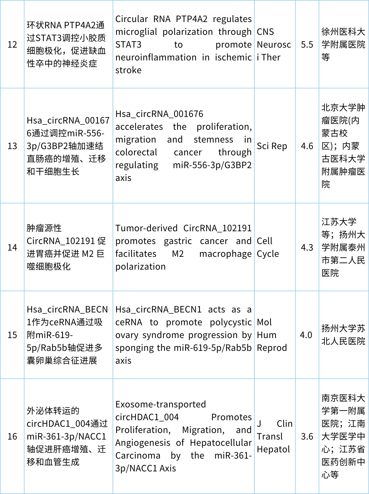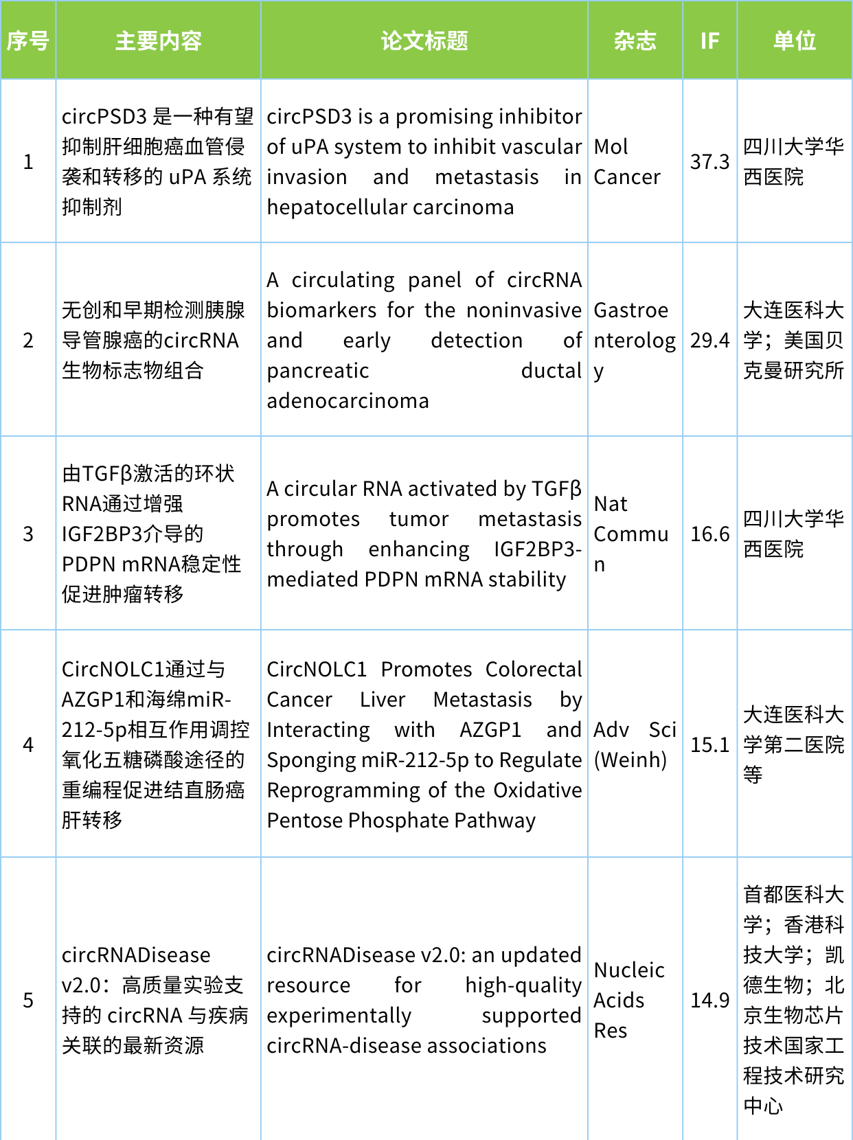 欢迎各位来到“circRNA研究汇总”栏目,本期从pubmed中检索收集最新发布的circRNA文献共计21篇,现在让我们一起看看circRNA研究最近有哪些新进展。 检索式:(circRNA[Title/Abstract]) OR circular RNA[Title/Abstract] 研究汇总列表 分类: circRNA与疾病, 前沿动态, 最新重要进展, 每周进展汇总, 研究热点跟踪admin十月 30, 2023评论