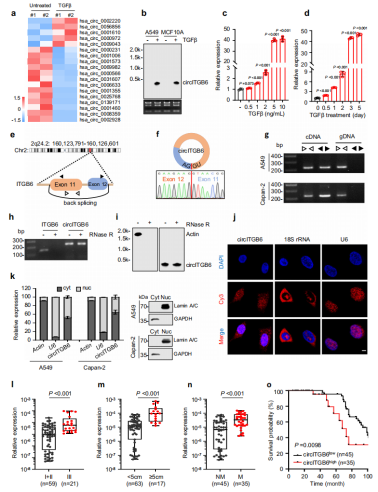转录组对TGFβ处理和未处理的MCF10A细胞样本进行测序发现,circITGB6(hsa_circ_0056856)在TGFβ处理组中表达量最高,后续也在细胞水平上有进一步验证,并呈现剂量依赖性(图1a-d)。这提示TGFβ可诱导circITGB6表达。