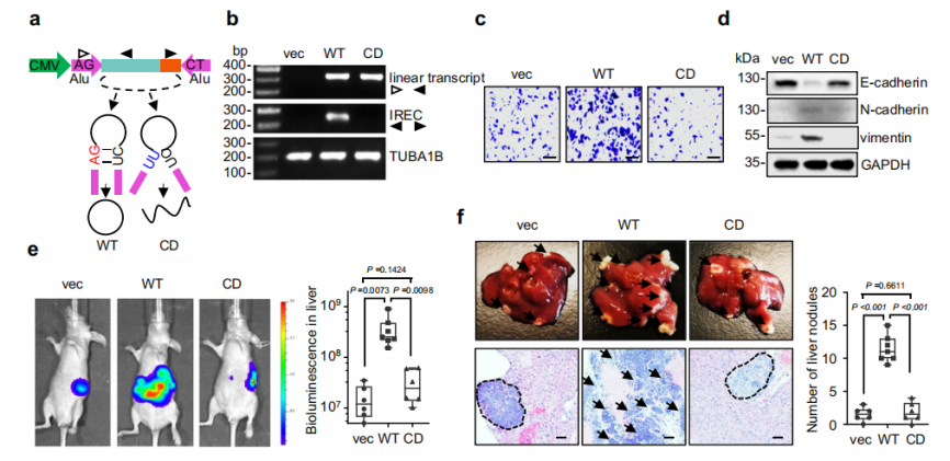 考虑到环状RNA过表达质粒产生大量的线性转录本,这些转录本可能没有完全转化为环状RNA。为了排除这种可能性,作者将circITGB6-OE质粒从AG突变为TT,生成不能成环的(CD)突变体(图3a-b)。与野生型相比,circITGB6-CD对EMT过程和细胞迁移没有明显影响;体外小鼠模型实验进一步证实了上述结果(图3c-f)。综上所述,circITGB6诱导了EMT过程和肿瘤转移,而不依赖于其线性转录本。