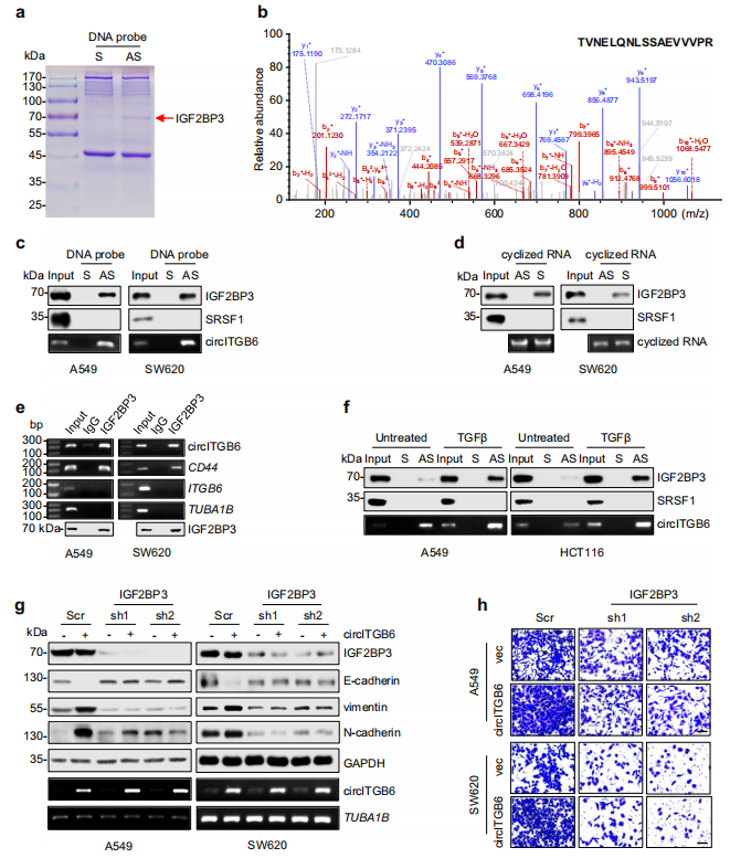 为了鉴定circITGB6相互作用的蛋白,作者采用pulldown技术(探针法)钓取蛋白,然后跑考马斯发现70kDa(红色箭头)位置有一条蛋白条带突出,切胶质谱发现,胰岛素样生长因子2 mRNA结合蛋白3(IGF2BP3)在circITGB6潜在相互作用蛋白中得分最高(图4a-b)。随后作者又多方面印证circITGB6结合IGF2BP3(图4e)。此外,在TGFβ刺激下,由于circITGB6丰度的增加,IGF2BP3和circITGB6互作也增强(图4f)。免疫荧光和荧光原位杂交(IF/FISH)显示,circITGB6和IGF2BP3共定位,且不受circITGB6敲除或TGFβ应激的影响。因此,提示circITGB6和IGF2BP3之间的相互作用没有细胞类型/组织特异性。