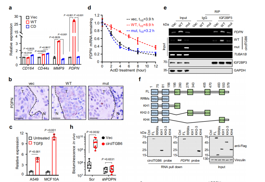 考虑到IGF2BP3通过不同的RNA结合KH结构域与其它RNA结合,作者构建了具有单个KH结构域的IGF2BP3截断突变体,分析IGF2BP3如何与circITGB6和PDPN mRNA相互作用(图6f)。使用针对circITGB6或PDPN mRNA的探针进行pulldown分析显示,IGF2BP3的KH1结构域特异性结合circITGB6,而KH4结构域特异性结合PDPN mRNA(图6f),这一结果排除circITGB6与PDPN mRNA竞争结合IGF2BP3的相同KH结构域。