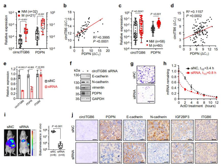 考虑到circITGB6在肿瘤转移中的关键作用及其与癌症进展的相关性,那circITGB6是否可能成为转移前肿瘤的潜在治疗靶点呢?为此,作者设计了circITGB6的siRNA,并验证了其只针对circITGB6敲低,而非ITGB6转录本(图8e)。结果发现,circITGB6 siRNA处理有效降低PDPN在mRNA和蛋白水平上的表达,并重新塑造了EMT标记物的表达,并抑制了细胞迁移;并且,敲低circITGB6后,PDPN mRNA的半衰期变短(图7f-h)。综上,敲低circITGB6可有效抑制肿瘤转移。